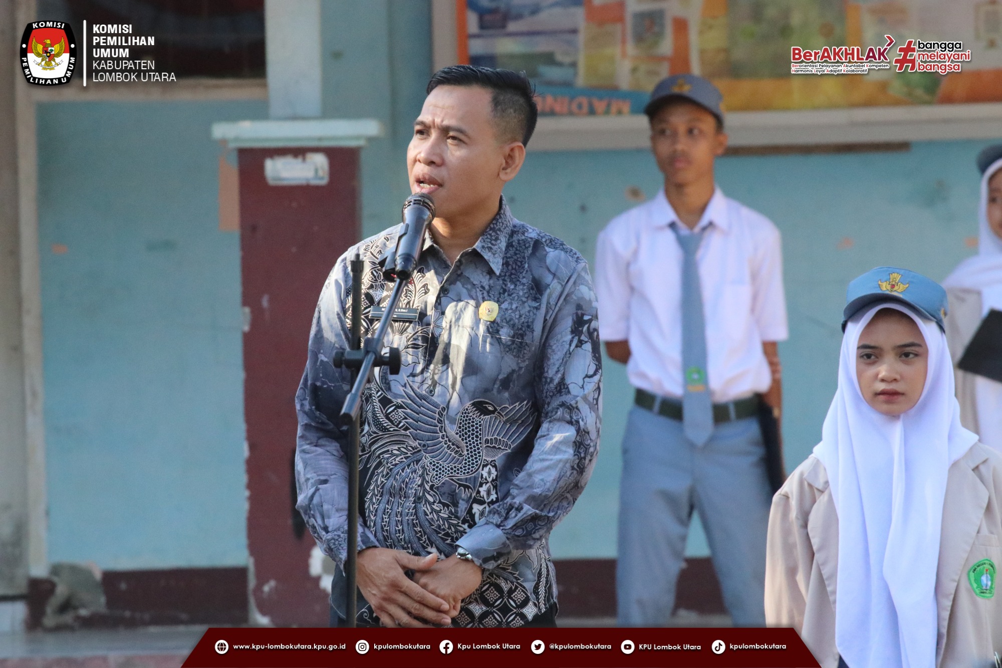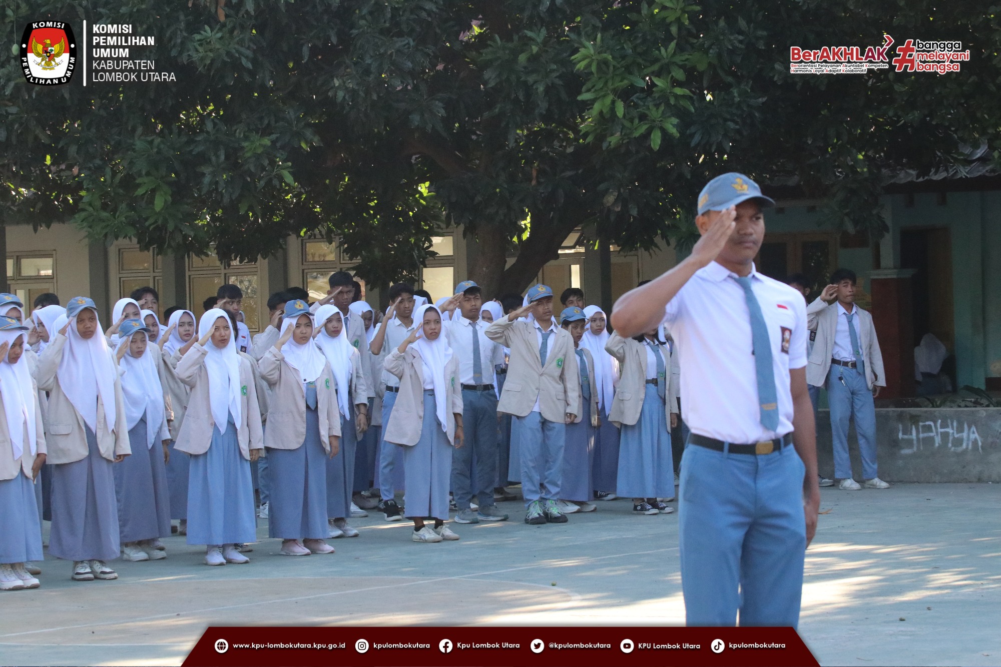 Gangga (kpu-lombokutarakab.go.id)-Komisi Pemilihan Umum Kabupaten Lombok Utara melaksanakan Sosialisasi Pendidikan Demokrasi kepada Pemilih Pemula dengan menjadi Pembina Upacara di SMA Negeri 1 Pemenang bertempat di Halaman Sekolah SMAN 1 Pemenang, Senin (22/9/25).