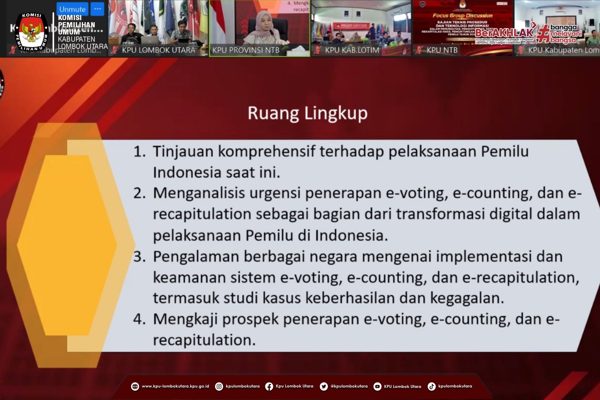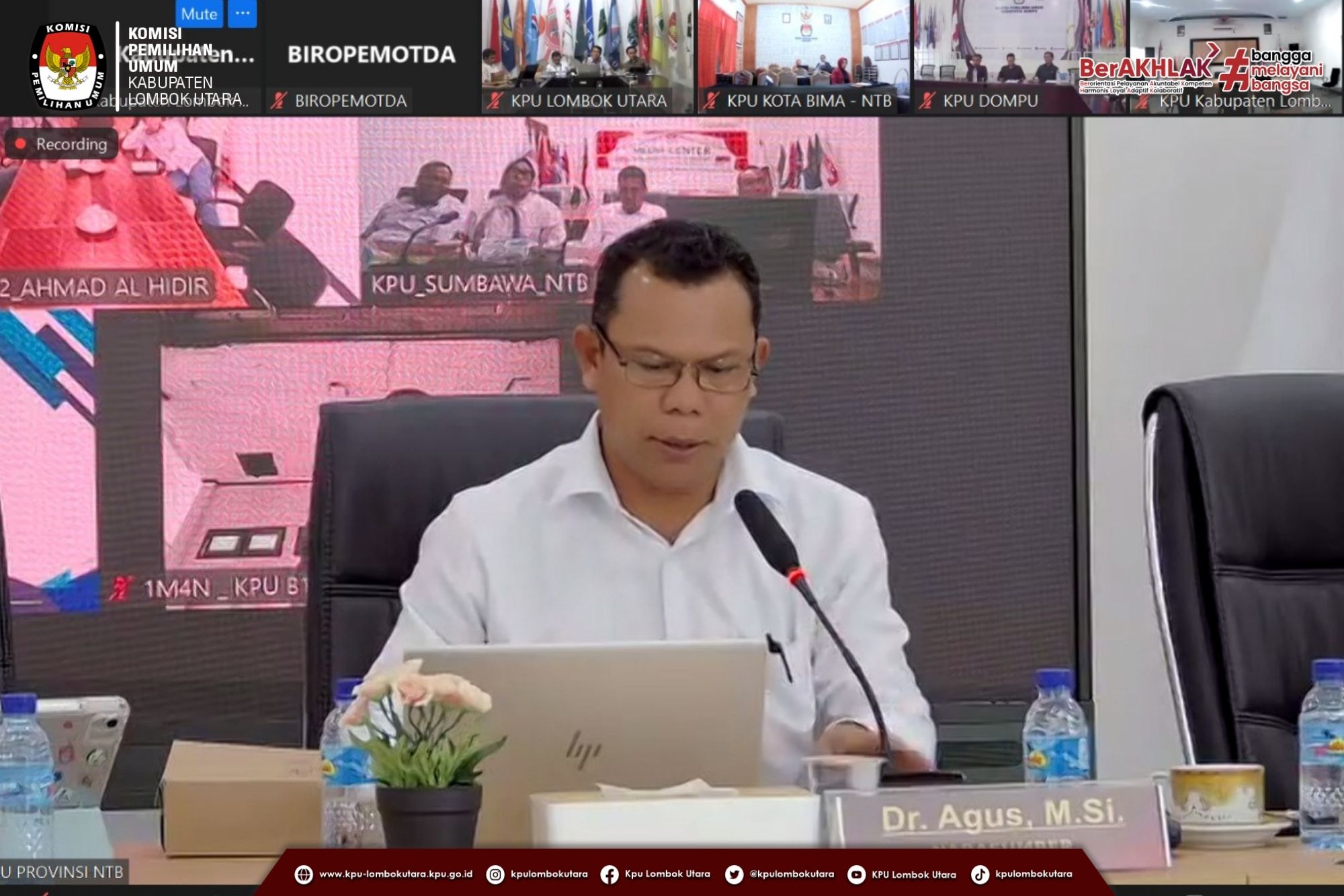Gangga (kpu-lombokutarakab.go.id)-Komisi Pemilihan Umum Kabupaten Lombok Utara mengikuti kegiatan kajian teknis sistem pemilu, kampanye, dan dana kampanye, serta prosedur dan teknologi informasi dalam pemungutan, perhitungan, dan rekapitulasi hasil pemungutan perolehan suara dalam Pemilu tahun 2024, Dilaksanakan oleh KPU Provinsi NTB dari tanggal 29-30 September 2025 dan diikuti oleh seluruh KPU Kabupaten/Kota Se-NTB secara Daring melalui zoom meeting, Senin (30/09/2025).