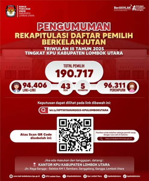 Pengumuman Rekapitulasi Daftar Pemilih Berkelanjutan (PDPB) Triwulan III Tahun 2025 Kabupaten Lombok Utara.