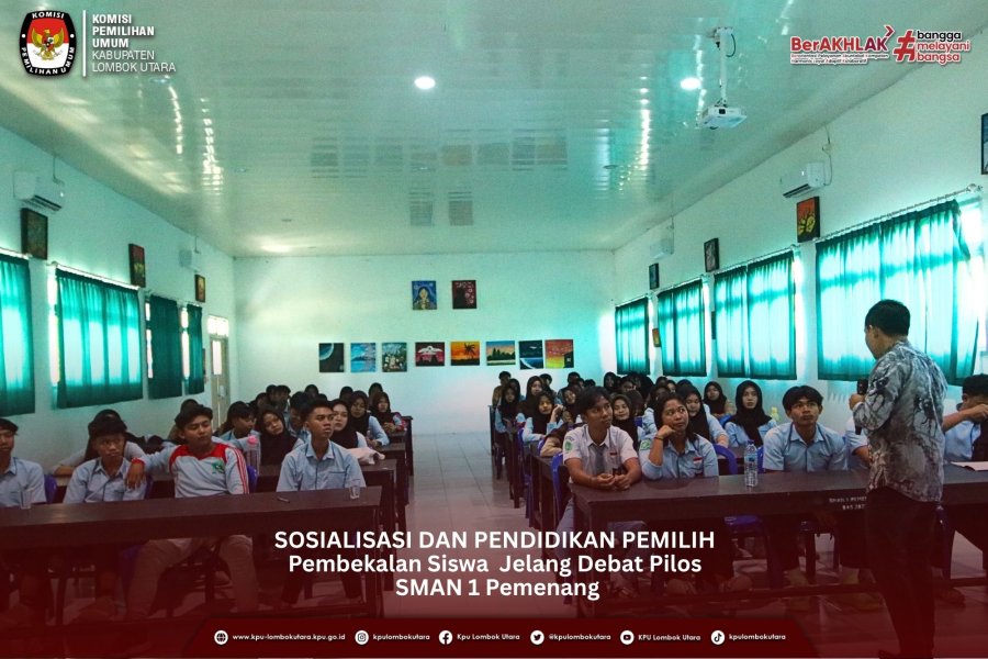 Gangga (kpu-lombokutarakab.go.id)-Ketua beserta Jajaran Sekretariat Komisi Pemilihan Umum Kabupaten Lombok Utara menggelar sosialisasi pendidikan pemilih bagi siswa SMAN 1 Pemenang Kegiatan ini bertujuan untuk membekali siswa sebagai pemilih pemula jelang pelaksanaan debat pemilihan ketua OSIS (Pemilos) bertempat di aula sekolah SMAN 1 Pemenang, Kamis (09/10/25).