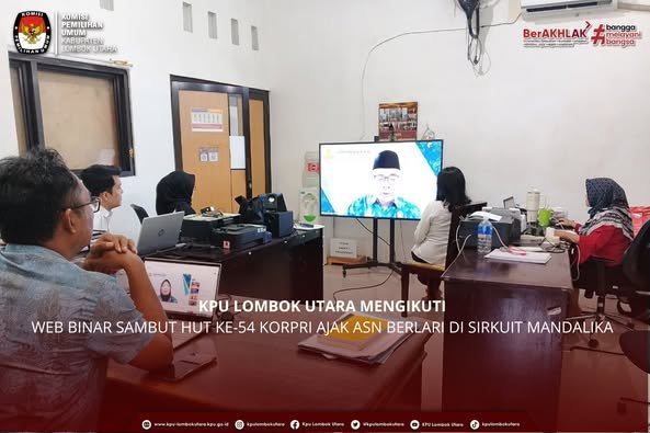 Komisi Pemilihan Umum Kabupaten Lombok Utara mengikuti Webinar "Korpri Menyapa ASN" seri ke-132 Dalam rangka menyambut Hari Ulang Tahun (HUT) ke-54 Korpri secara virtual dan disiarkan langsung melalui platform Zoom serta kanal YouTube resmi Setjen DP Korpri Nasional Pusat pada Kamis (16/10/2025).