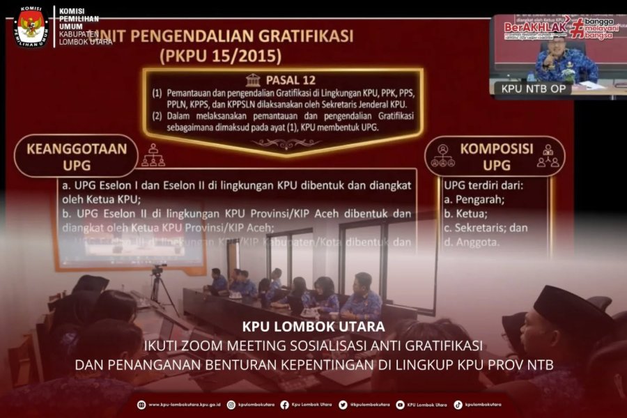 Gangga (kpu-lombokutarakab.go.id)-Komisi Pemilihan Umum Kabupaten Lombok Utara mengikuti kegiatan Sosialisasi Anti Gratifikasi dan Penanganan Benturan Kepentingan dilingkungan KPU Provinsi NTB untuk penguatan integritas, pencegahan tindak pidana korupsi, serta peningkatan kualitas tata kelola kelembagaan (good governance).Kegiatan ini diselenggarakan oleh KPU Provinsi Nusa Tenggara Barat (NTB) secara daring pada Senin(1/12/2025).