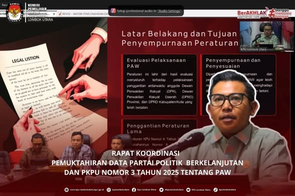 Gangga (kpu-lombokutarakab.go.id)-Komisi Pemilihan Umum Kabupaten Lombok Utara menyelenggarakan Rapat Koordinasi Pemutakhiran Data Partai Politik Berkelanjutan Semester II Tahun 2025 sekaligus Sosialisasi PKPU Nomor 3 Tahun 2025 tentang Penggantian Antarwaktu (PAW) melalui Zoom Meeting pada Kamis (18/12/2025).