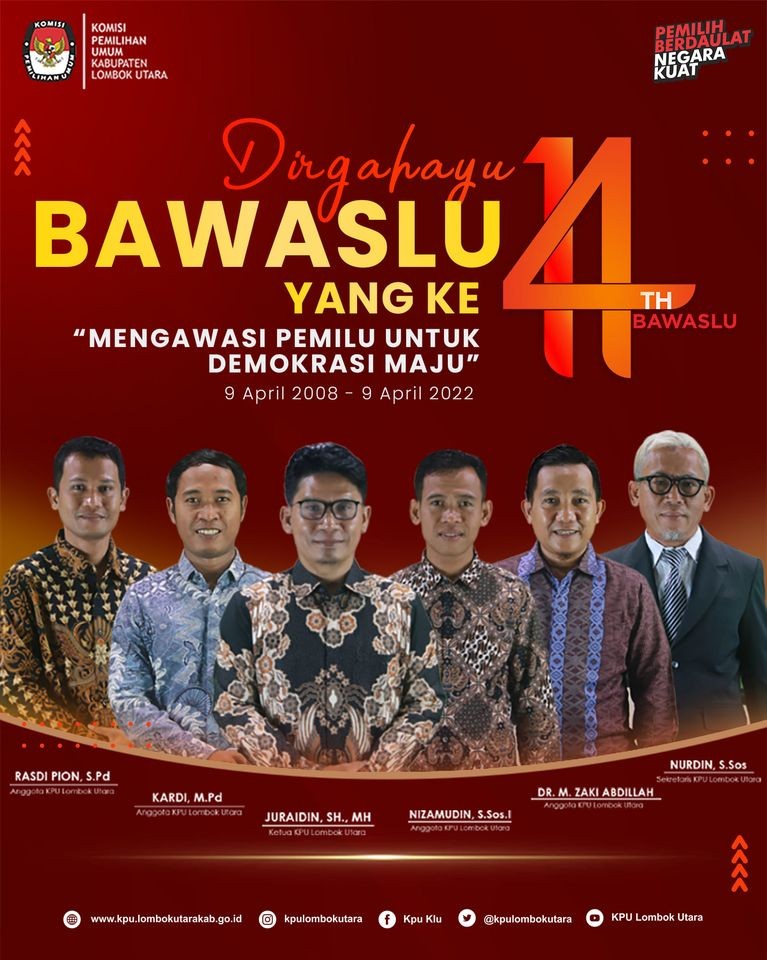 Keluarga Besar KPU Kabupaten Lombok Utara mengucapkan selamat hari jadi untuk Badan Pengawas Pemilu (BAWASLU) yang ke-14.