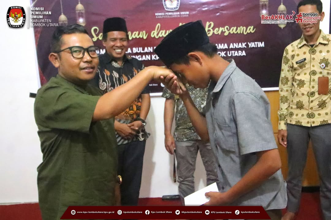 Rangkaian kegiatan ditutup dengan penyerahan santunan kepada anak-anak yatim piatu dan sesi foto Bersama (HUMAS DAN SDM-KPU-KLU).