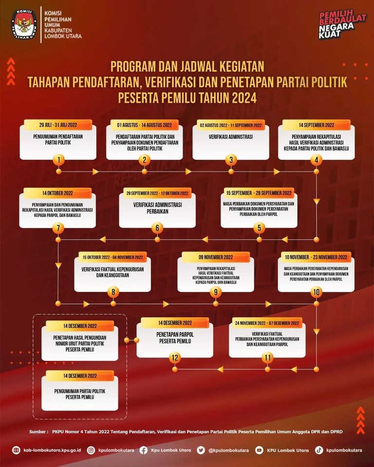 Infografis Tahapan, Program dan Jadwal Pendaftaran, Verifikasi dan Penetapan Partai Politik Peserta Pemilu Anggota DPR dan DPRD dalam Pemilihan Umum Tahun 2024.