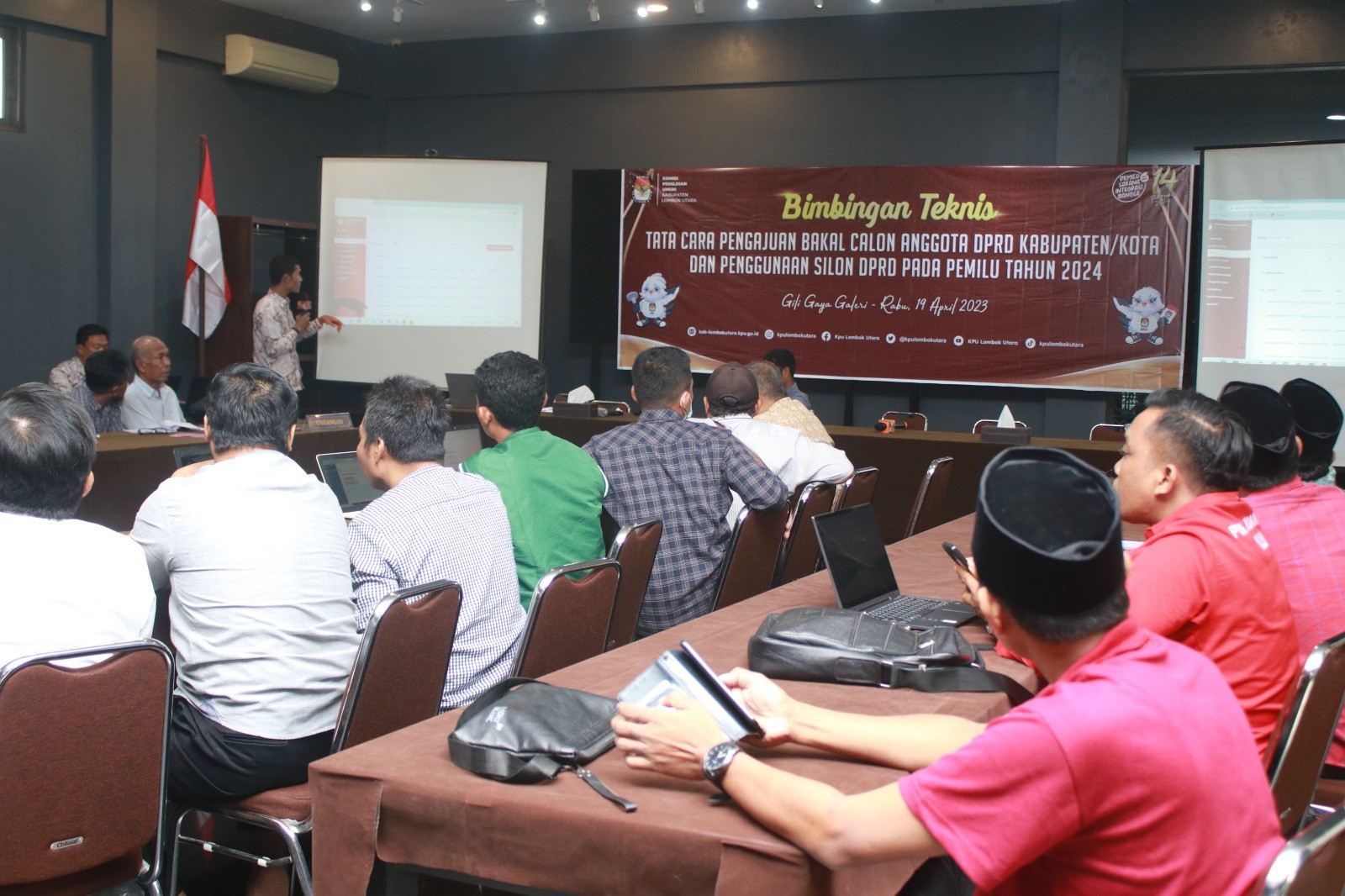 Gangga(kab-lombokutara.kpu.go.id)-Komisi Pemilihan Umum (KPU) Kabupaten Lombok Utara ((KLU) Menggelar Bimbingan Teknis Tata Cara Pengajuan Bakal Calon DPRD Kabupaten/Kota dan Penggunaan Silon DPRD Pada Pemilu 2024 diikuti oleh Ketua dan Anggota KPU KLU, Pimpinan dan Operator Silon Partai Politik Se- KLU bertempat di Gili Gaya Galeri Pemenang. Rabu (19/04).