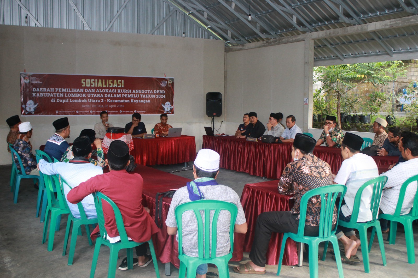 GANGGA (kpu-lombokutarakab.go.id)–Komisi Pemilihan Umum Kabupaten Lombok Utara (KLU) menggelar sosialisasi Daerah Pemilihan (Dapil) dan Alokasi Kursi anggota DPRD Provinsi dan DPRD Kabupaten/Kota pada Pemilu 2024 di Dapil Lombok Utara Tiga Kecamatan Kayangan bertempat di Kedai Tiu Teja Santong.Minggu (02/04/23).