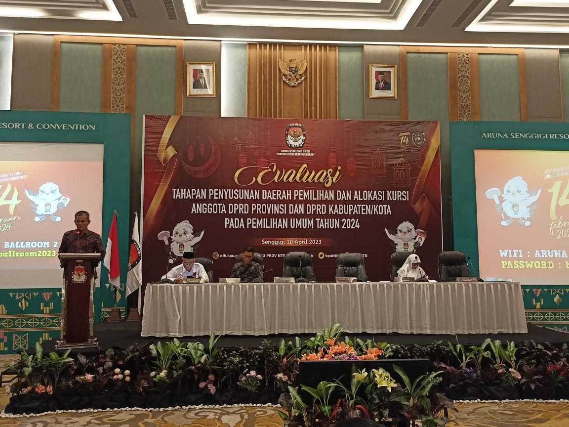 Kegiatan Evaluasi ini dibuka langsung oleh Ketua KPU Provinsi NTB Suhardi Soud, Dalam sambutannya menyampaikan bahwa malalui kegiatan evaluasi ini kita bisa melanjutkan agenda-agenda KPU untuk menuju tugas akhir, kita bersyukur sebentar lagi kita akan melakukan pencalonan untuk DPRD Provinsi dan DPRD Kabupaten/Kota dimana didalam pencalonan itu ada unsur penting di dalam daerah pemilihan, Ada hal konstitusi dan ada jumlah yg harus di penuhi oleh para calon dan partai politik sesuai dengan jumlah kursi.