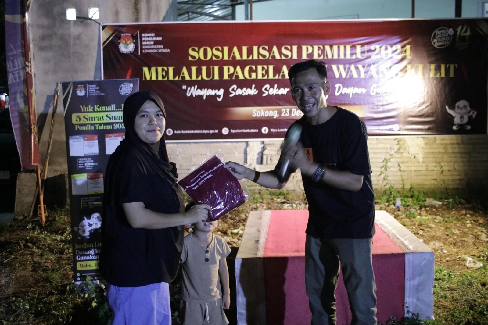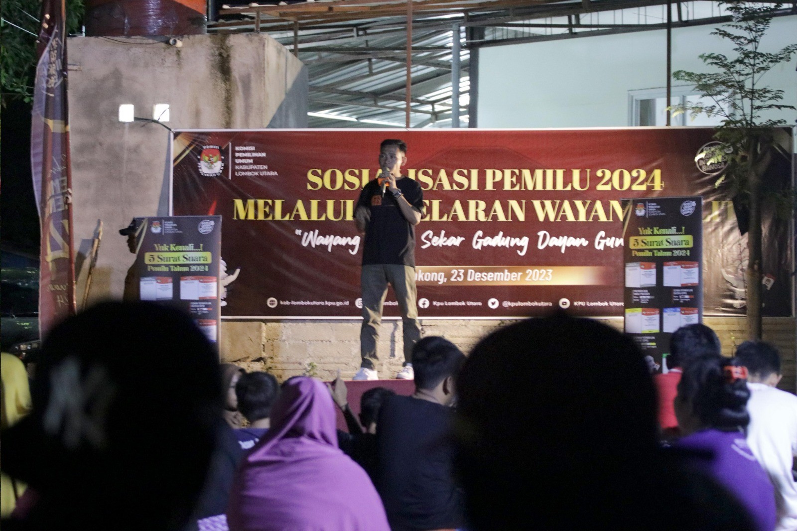 Gangga(kab-lombokutara.kpu.go.id)- Komisi Pemilihan Umum (KPU) Kabupaten Lombok Utara (KLU) menggelar kegiatan Sosialisasi Pemilu Tahun 2024 melalui Pagelaran Wayang Kulit Sasak Sekar Gadung Dayan Gunung Pimpinan Bapak Dulatip bertempat di Dusun Tlotok, Desa Sokong Kecamatan Tanjung. Sabtu (23/12).