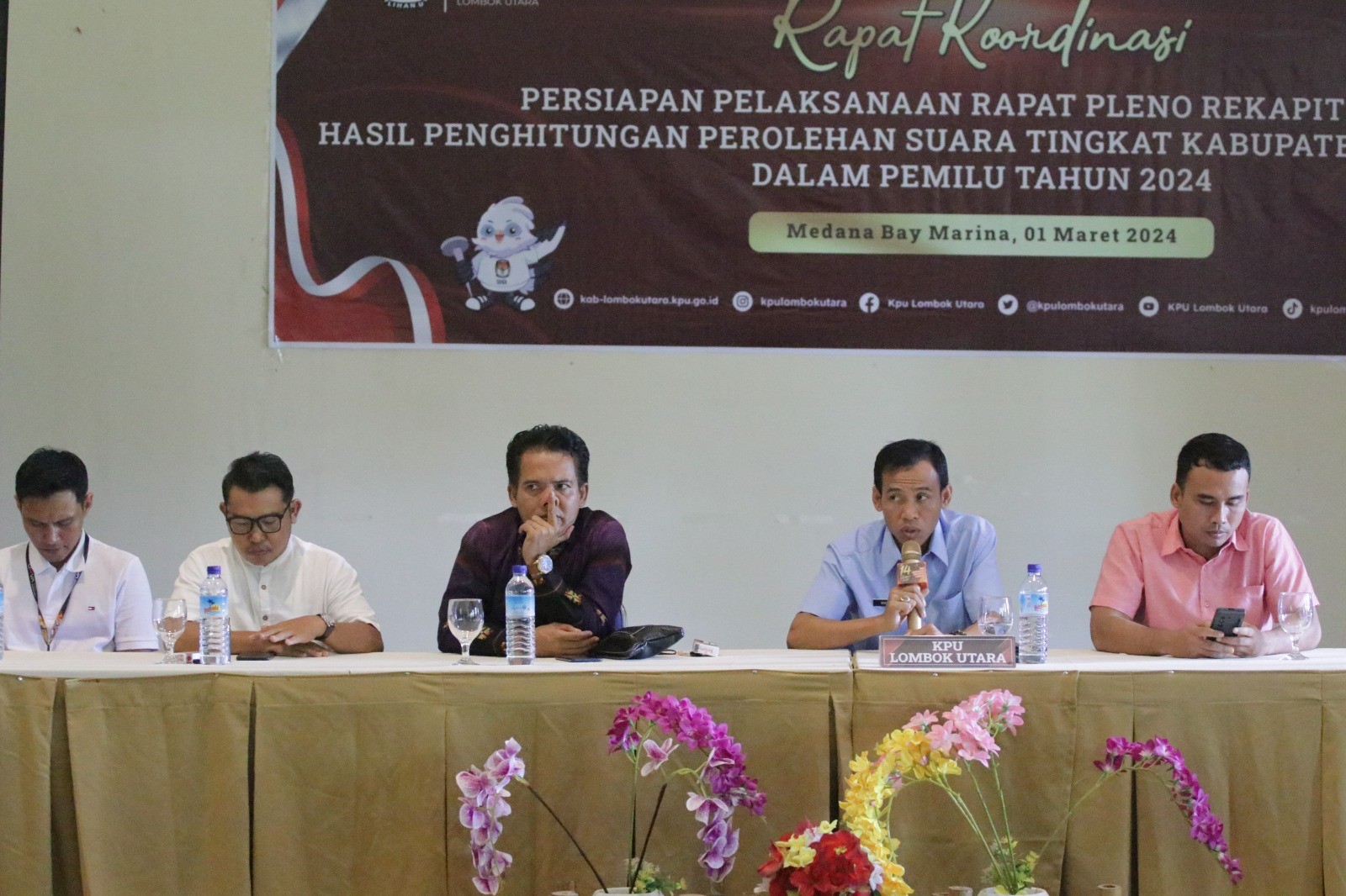 Gangga(kab-lombokutara.kpu.go.id)- Komisi Pemilihan Umum Kabupaten Lombok Utara menggelar Rapat Koordinasi Persiapan Pelaksanaan Rapat Pleno Rekapitulasi Hasil Penghitungan Perolehan Suara Tingkat Kabupaten lombok Utara dalam pemilu tahun 2024 bertempat di Medana Bay Marina Tanjung. Jumat (01/03).