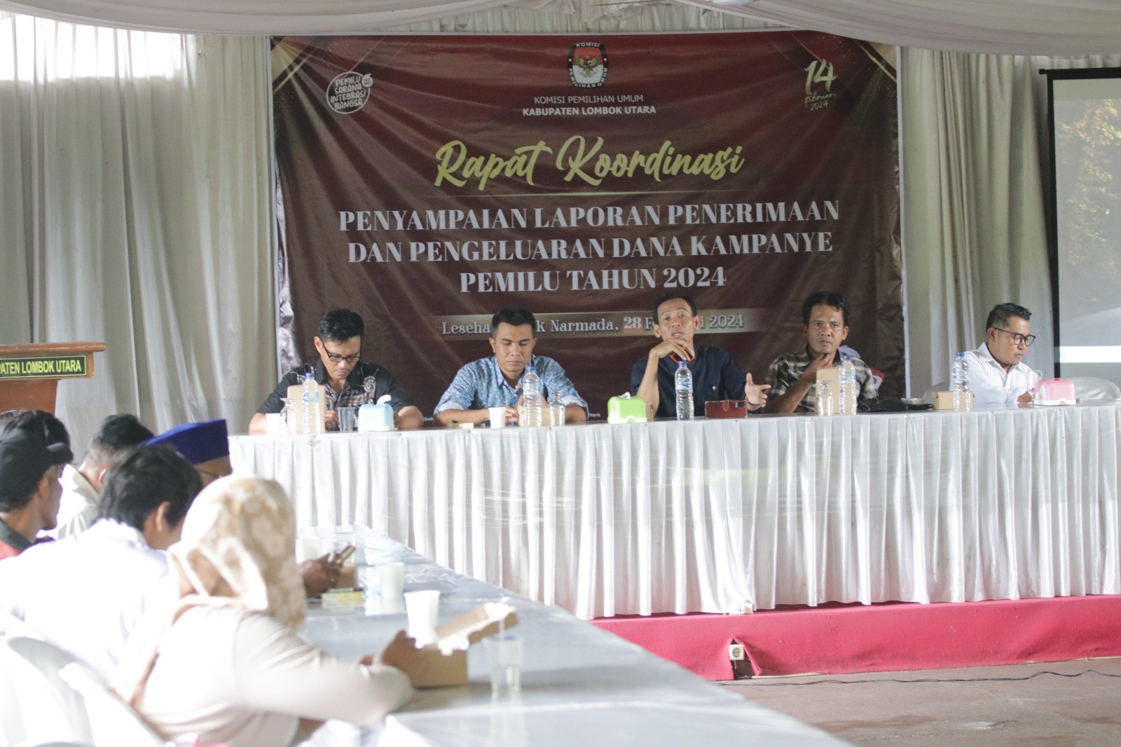 Nizamudin (Ketua KPU KLU) dalam sambutannya menyampaikan bahwa tujuan kegiatan ini agar Partai Politik peserta pemilu dapat lebih memahami aturan pemakaian dana kampanye maupun pelaporannya, ada beberapa jenis pelaporan dana kampanye, Di antaranya Laporan Awal Dana Kampanye (LADK), Laporan Pemberi Sumbangan Dana Kampanye (LPSDK) dan Laporan Penerimaan dan Pengeluaran Dana Kampanye (LPPDK)