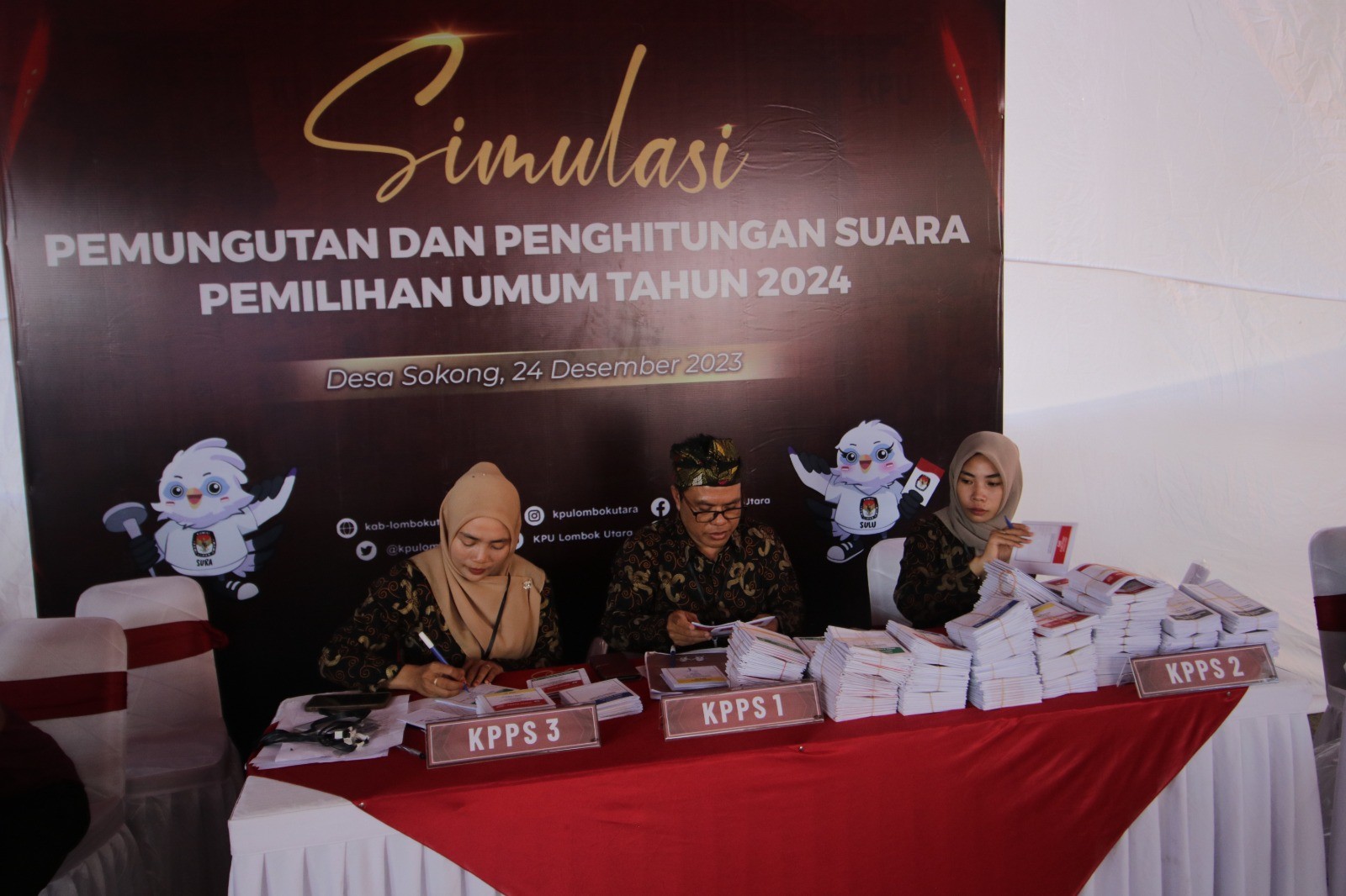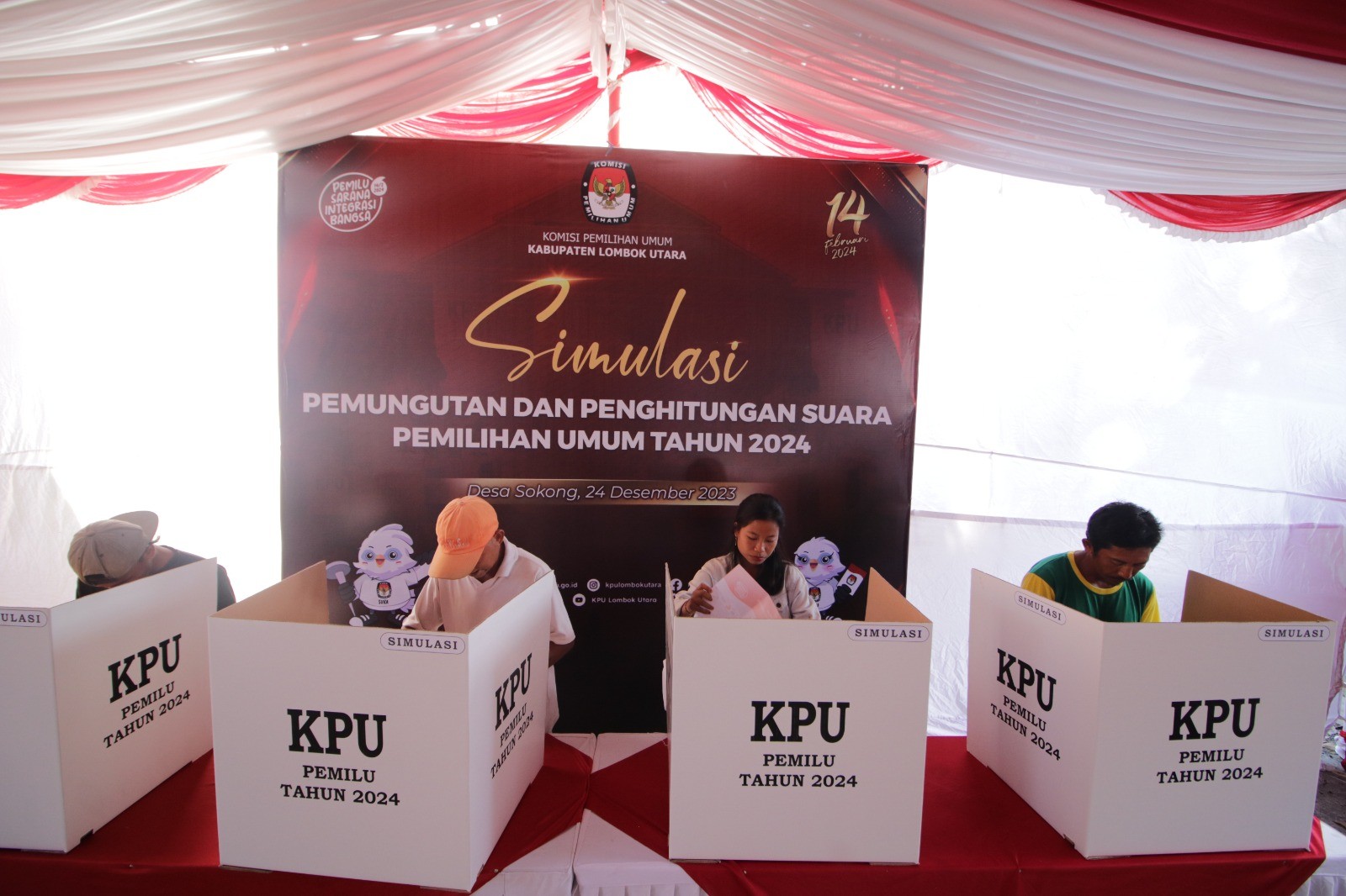 Gangga(kab-lombokutara.kpu.go.id)-Dalam rangka persiapan penyelenggaraan pemungutan dan penghitungan suara Pemilu tahun 2024, Komisi Pemilihan Umum (KPU) Kabupaten Lombok Utara (KLU) menggelar simulasi pemungutan dan penghitungan suara serta penggunaan aplikasi Sistem Informasi Rekapitulasi Suara (Sirekap) dalam Pemilu tahun 2024 di TPS 4 Dusun Prawira, Desa Sokong, Kecamatan Tanjung, Kabupaten Lombok Utara, Minggu (24/12).
