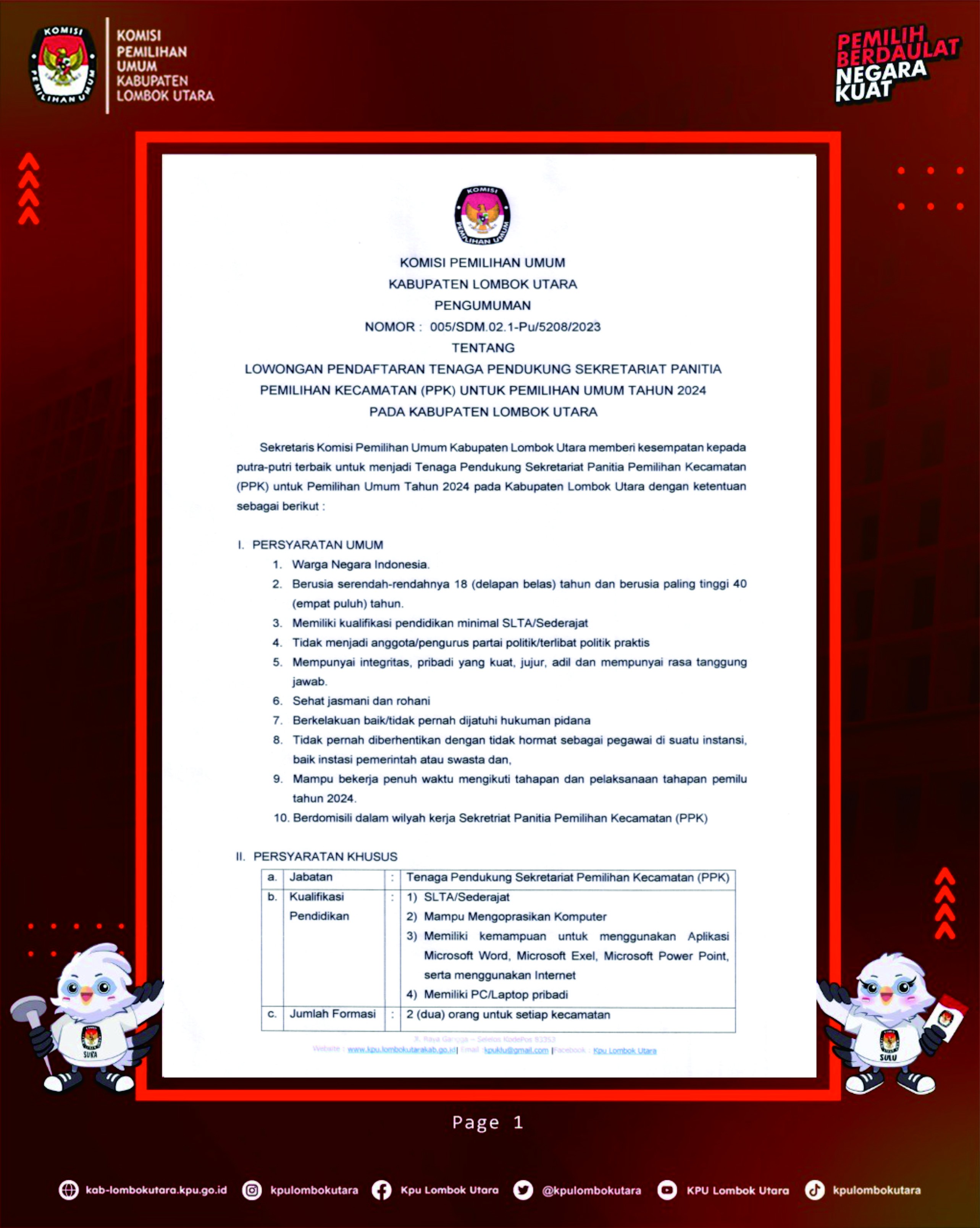 Lowongan Pendaftaran Tenaga Pendukung Sekretariat Panitia Pemilihan Kecamatan (PPK) Untuk Pemilihan Umum Tahun 2024 Pada Kabupaten Lombok Utara