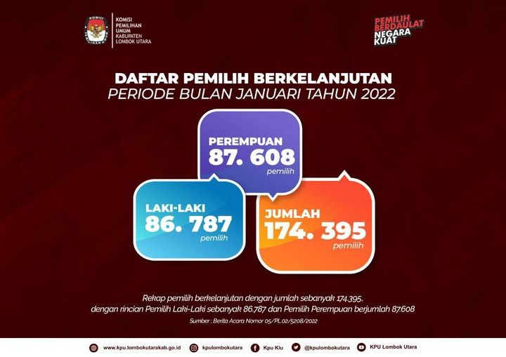 Hasil Rekapitulasi Daftar Pemilih Berkelanjutan Periode Januari sebanyak 174.395 ( Seratus Tujuh Puluh Empat Ribu Tiga Ratus Sembilan Puluh Lima) dengan rincian pemilih laki-laki berjumlah 86.787 (Delapan Puluh Enam Ribu Tujuh Ratus Delapan Puluh Tujuh) pemilih dan pemilih perempuan berjumlah 87.608 (Delapan Puluh Tujuh Ribu Enam Ratus Delapan) pemilih, tersebar di 5 (Lima) Kecamatan sesuai dengan rincian sebagaimana terlampir dalam Berita Acara ini,