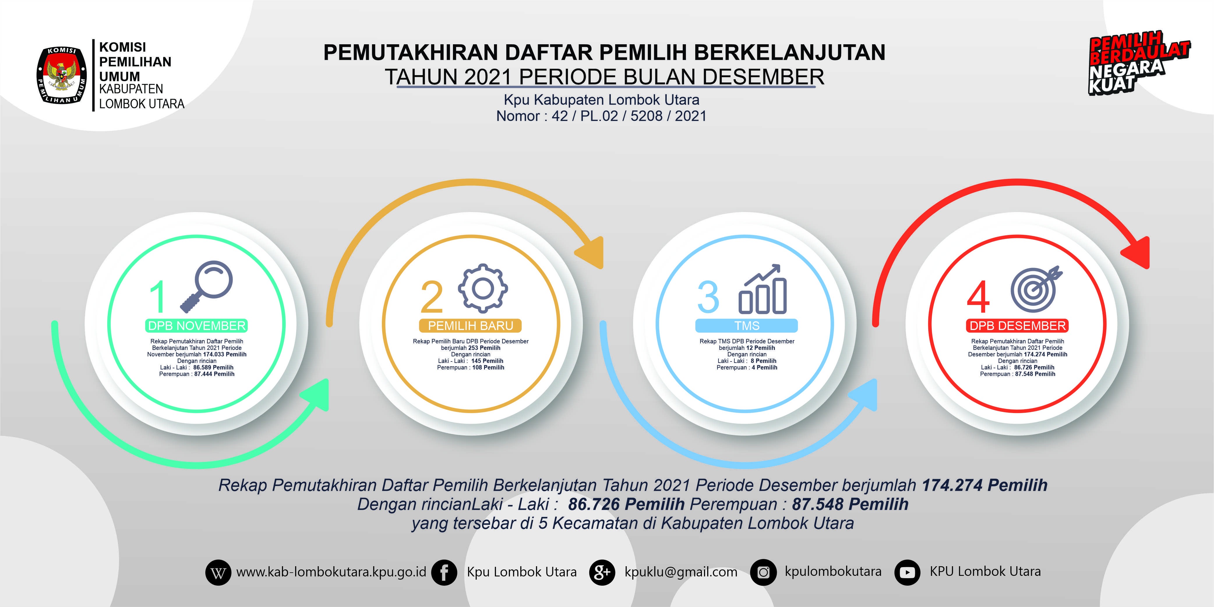 Rekapitulasi Pemutakhiran Daftar Pemilih Berkelanjutan Periode Desember Tahun 2021 KPU Lombok Utara dengan jumlah sebanyak 174.274 ( Seratus Tujuh Puluh Empat Ribu Dua Ratus Tujuh Puluh Empat) dengan rincian pemilih laki-laki berjumlah 86.726 (Delapan Puluh Enam Ribu Tujuh Ratus Dua Puluh Enam) pemilih dan pemilih perempuan berjumlah 87.548 (Delapan Puluh Tujuh Ribu Lima Ratus Empat Puluh Delapan) pemilih, tersebar di 5 (Lima) Kecamatan sesuai dengan rincian sebagaimana terlampir dalarn Berita Acara Nomor : 42/PL/02/5208/3032