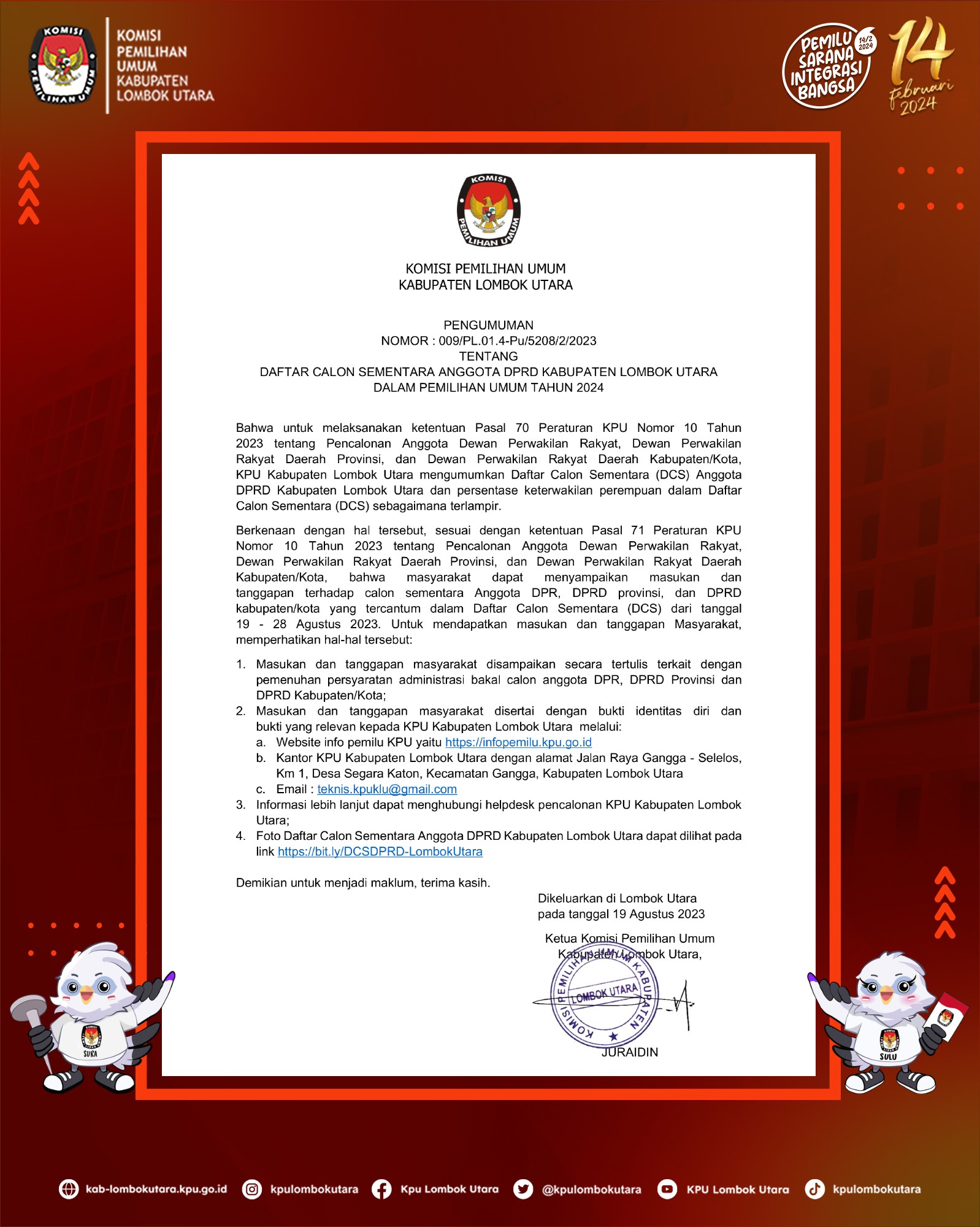 Pengumuman Daftar Calon Sementara Anggota DPRD Kabupaten Lombok Utara dalam Pemilihan Umum Tahun 2024