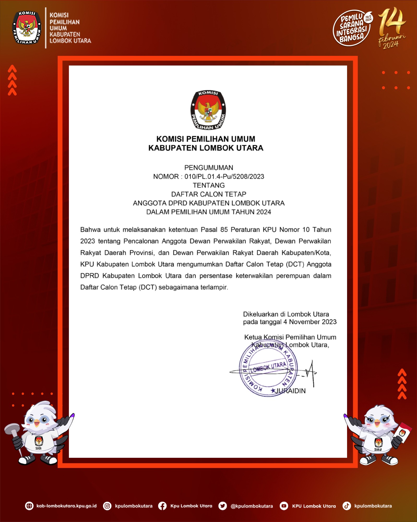 Pengumuman Daftar Calon Tetap Anggota DPRD Kabupaten Lombok Utara dalam Pemilihan Umum Tahun 2024