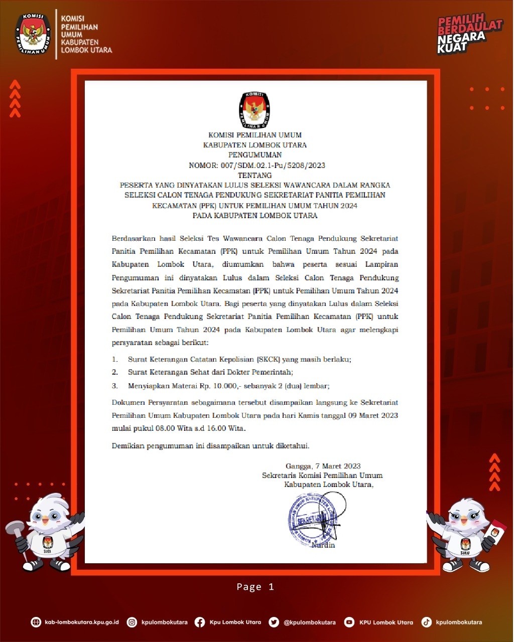 PESERTA YANG DINYATAKAN LULUS SELEKSI WAWANCARA DALAM RANGKA SELEKSI CALON TENAGA PENDUKUNG SEKRETARIAT PANITIA PEMILIHAN KECAMATAN (PPK) UNTUK PEMILIHAN UMUM TAHUN 2024 PADA KABUPATEN LOMBOK UTARA