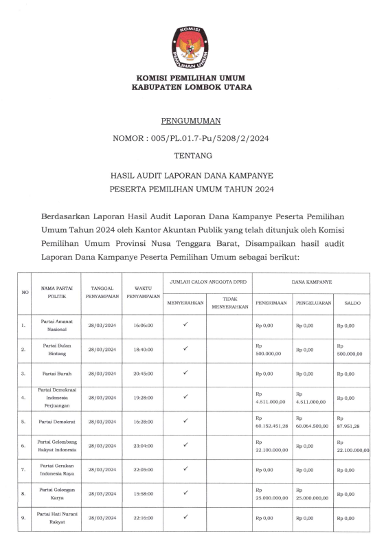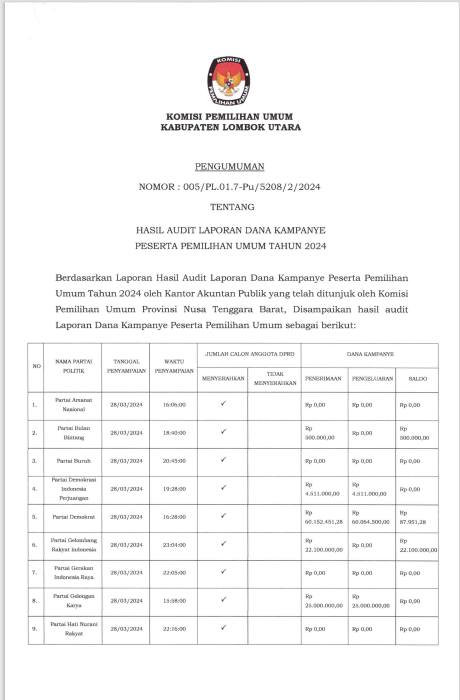 PENGUMUMAN HASIL AUDIT DANA KAMPANYE PESERTA PEMILIHAN UMUM TAHUN 2024 Kamis, 04 April 2024 18:08 75 PENGUMUMAN HASIL AUDIT LAPORAN DANA KAMPANYE PESERTA PEMILU 2024 Bagikan: Dilihat 75 Kali.