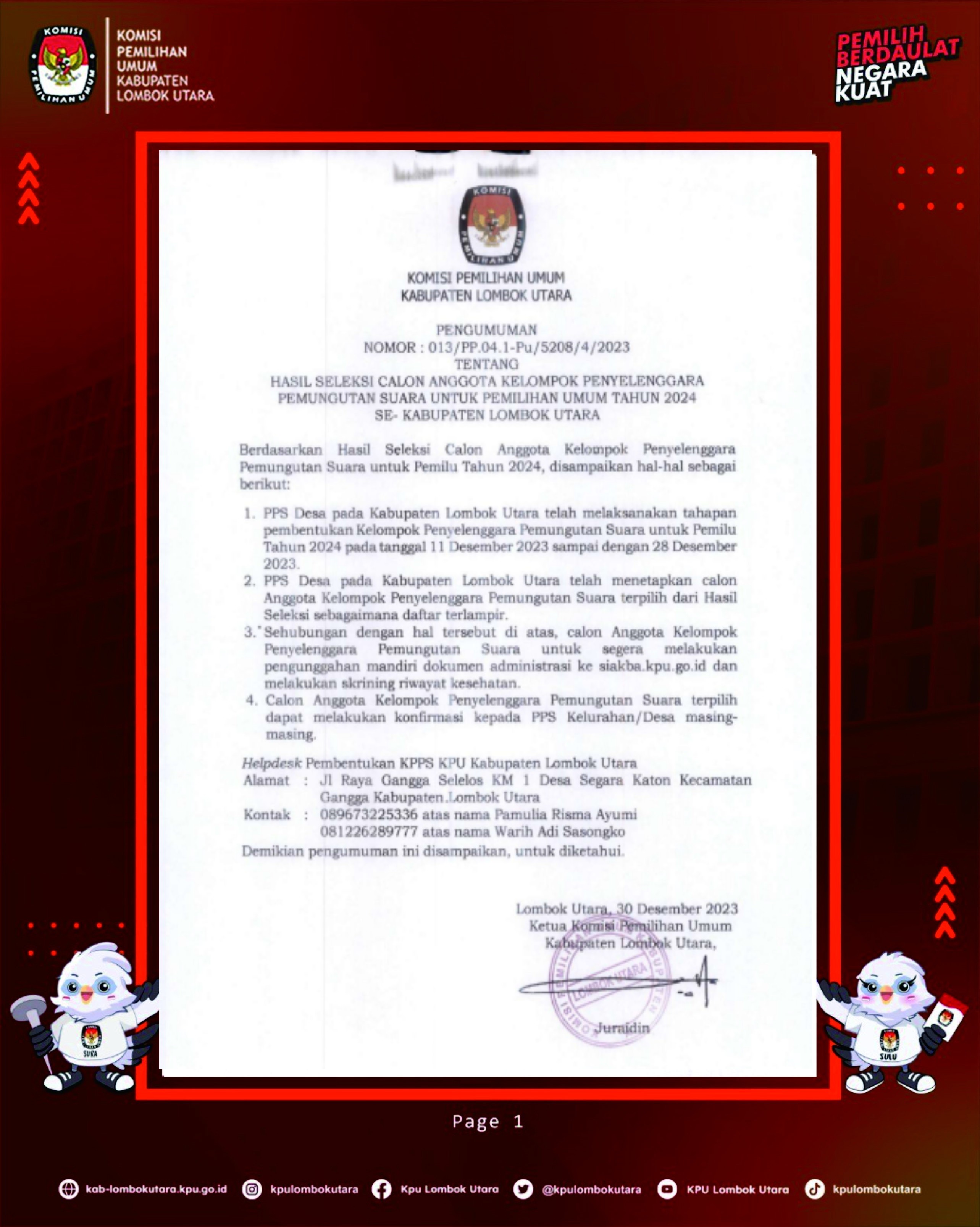 PENGUMUMAN HASIL SELEKSI CALON KPPS PEMILU TAHUN 2024 SE-KABUPATEN LOMBOK UTARA