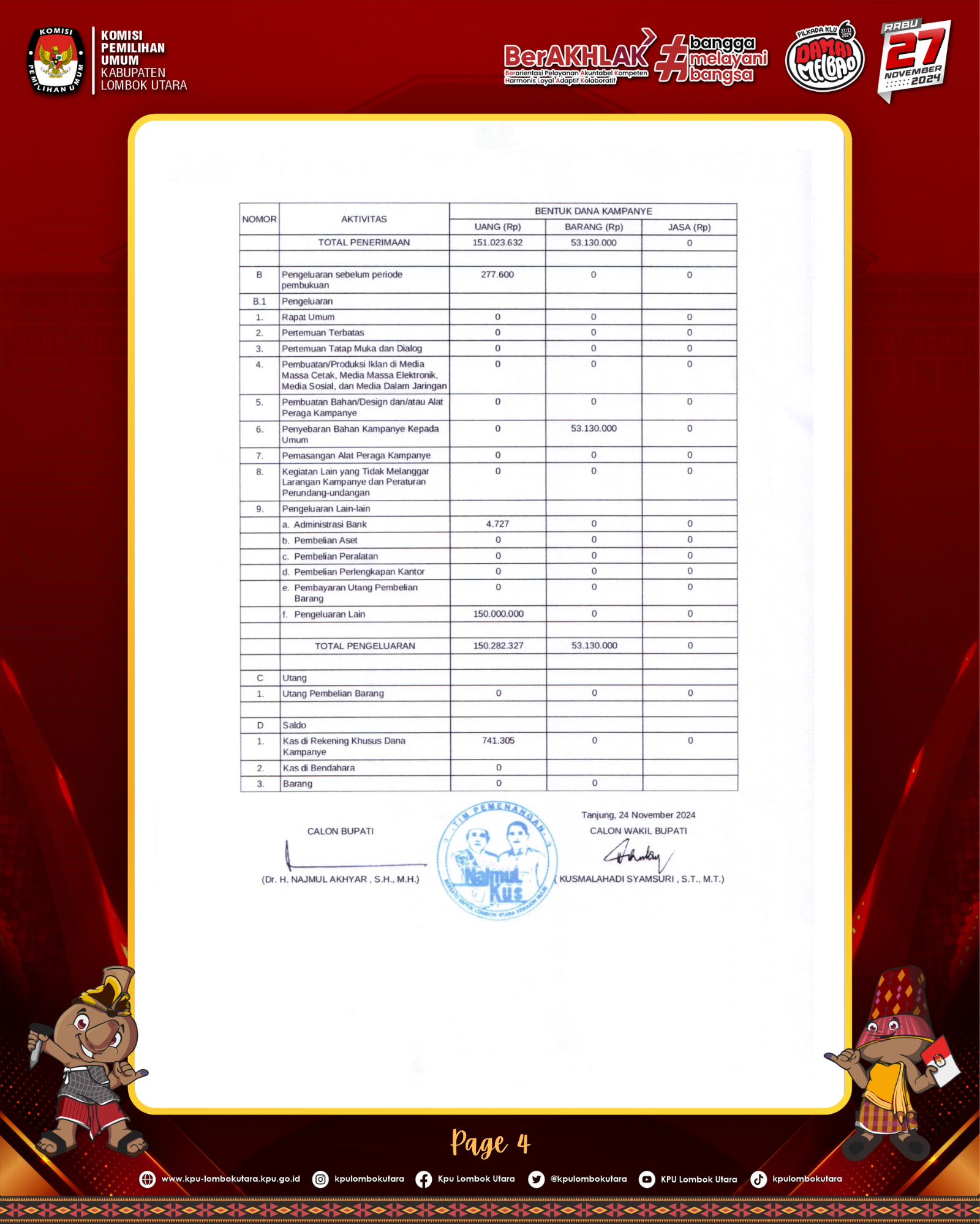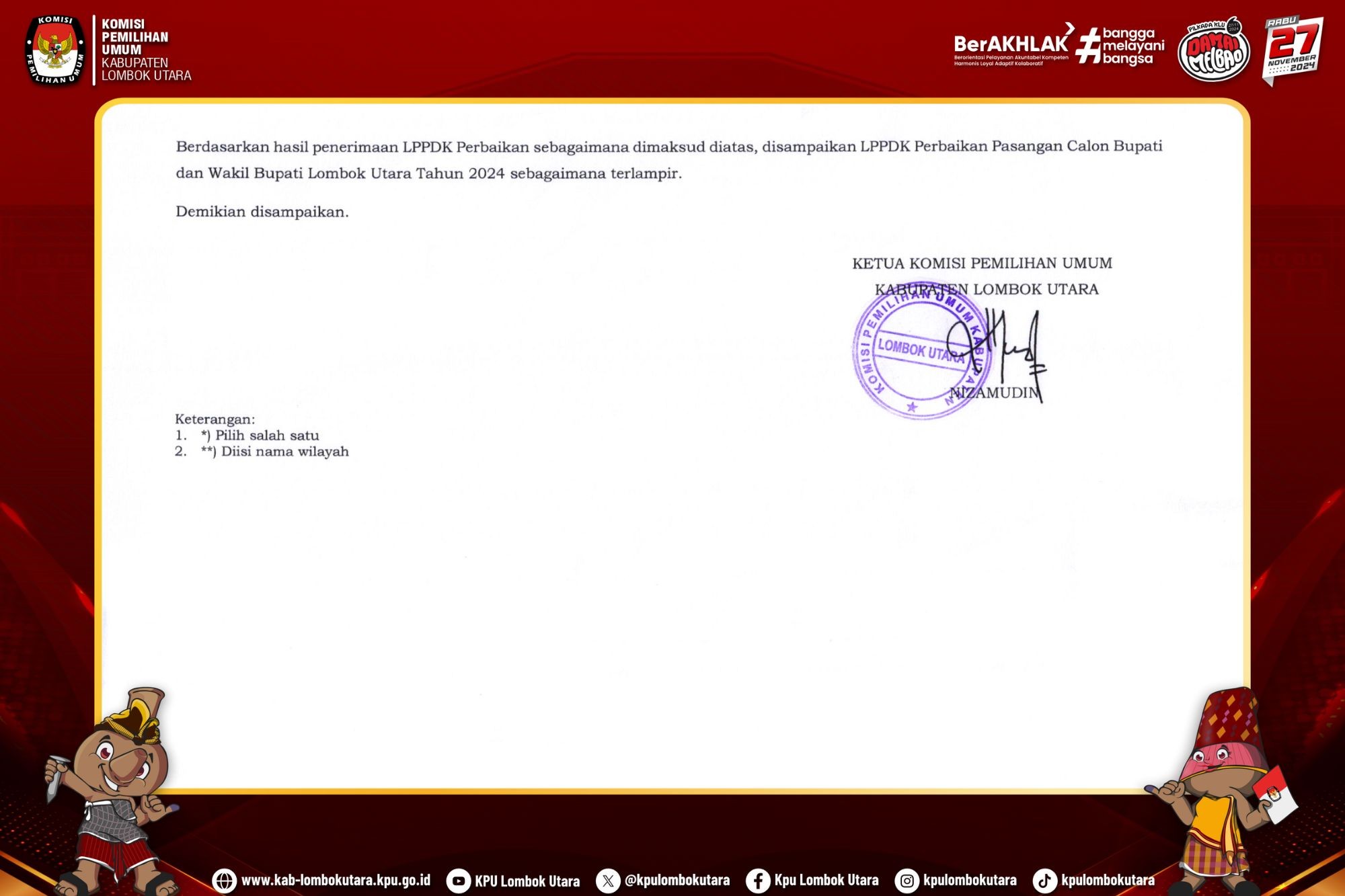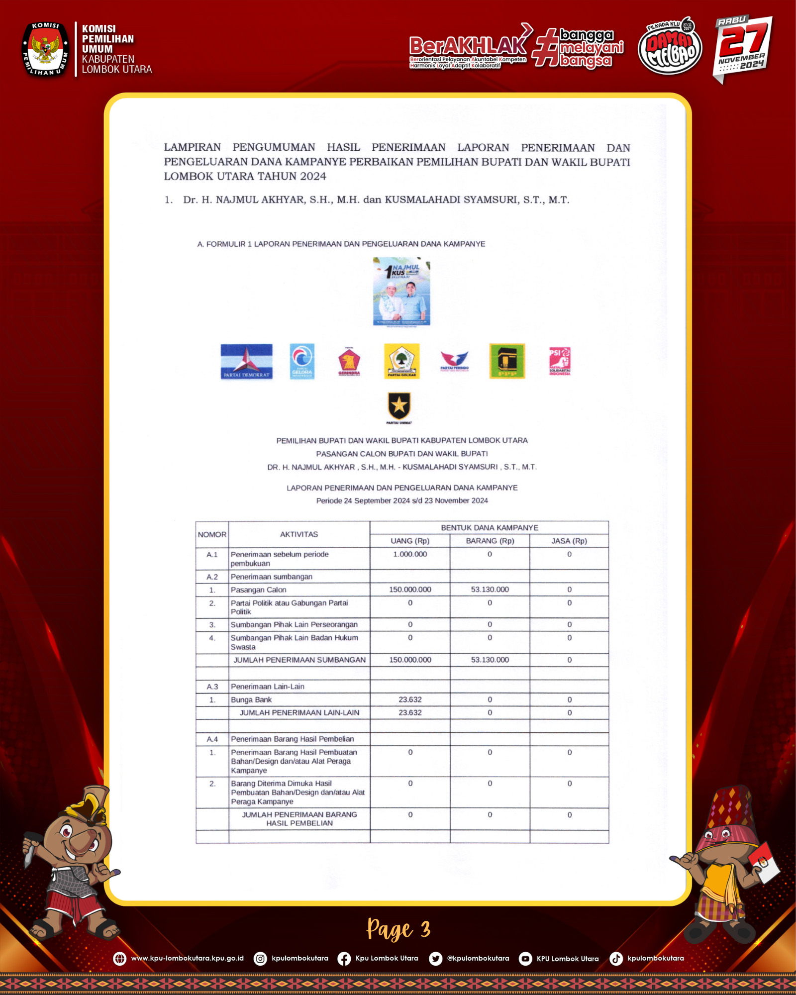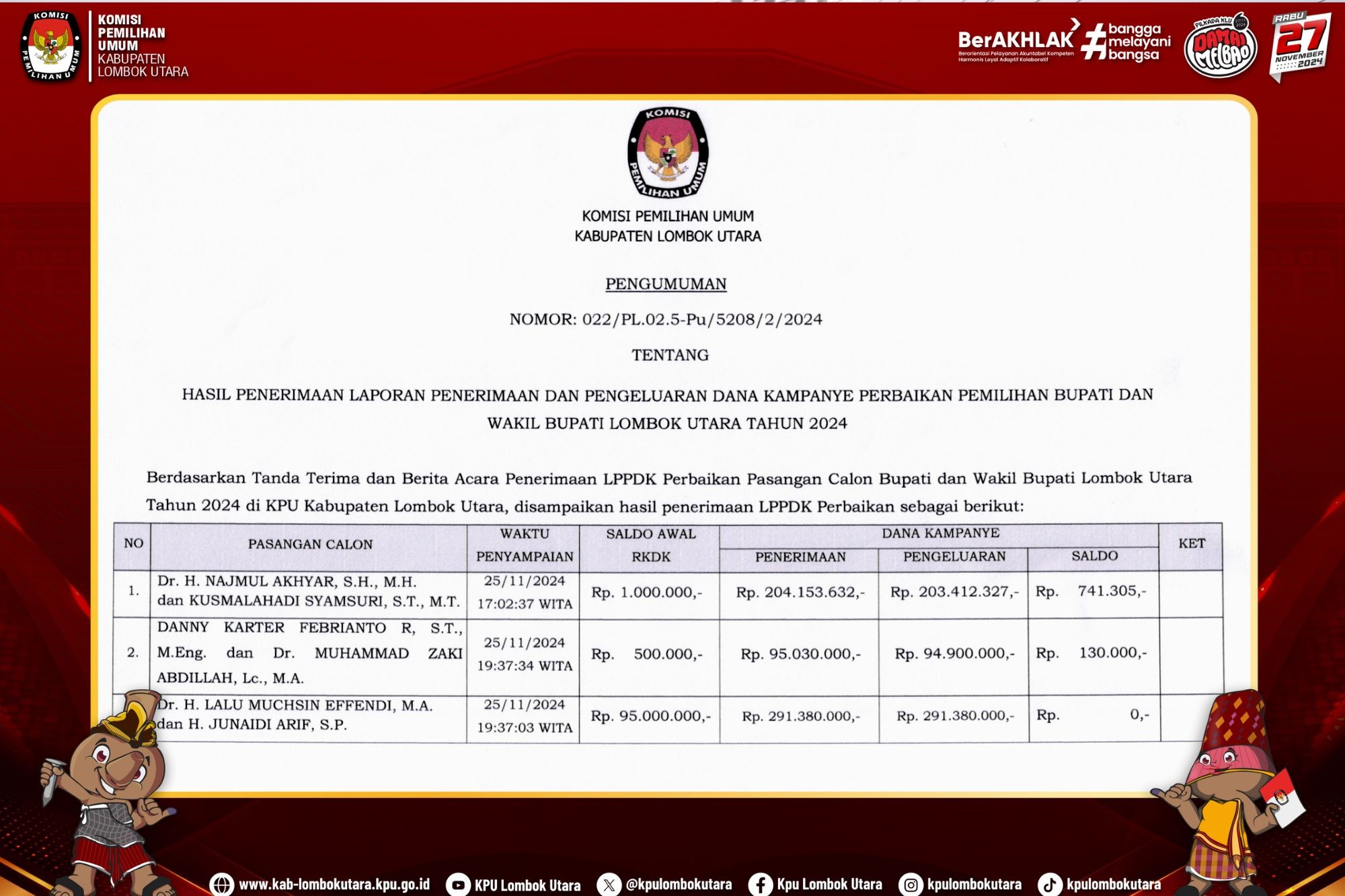 PENGUMUMAN KPU KABUPATEN LOMBOK UTARA TENTANG HASIL PENERIMAAN LAPORAN PENERIMAAN DAN PENGELUARAN DANA KAMPANYE PERBAIKAN PEMILIHAN BUPATI DAN WAKIL BUPATI LOMBOK UTARA TAHUN 2024