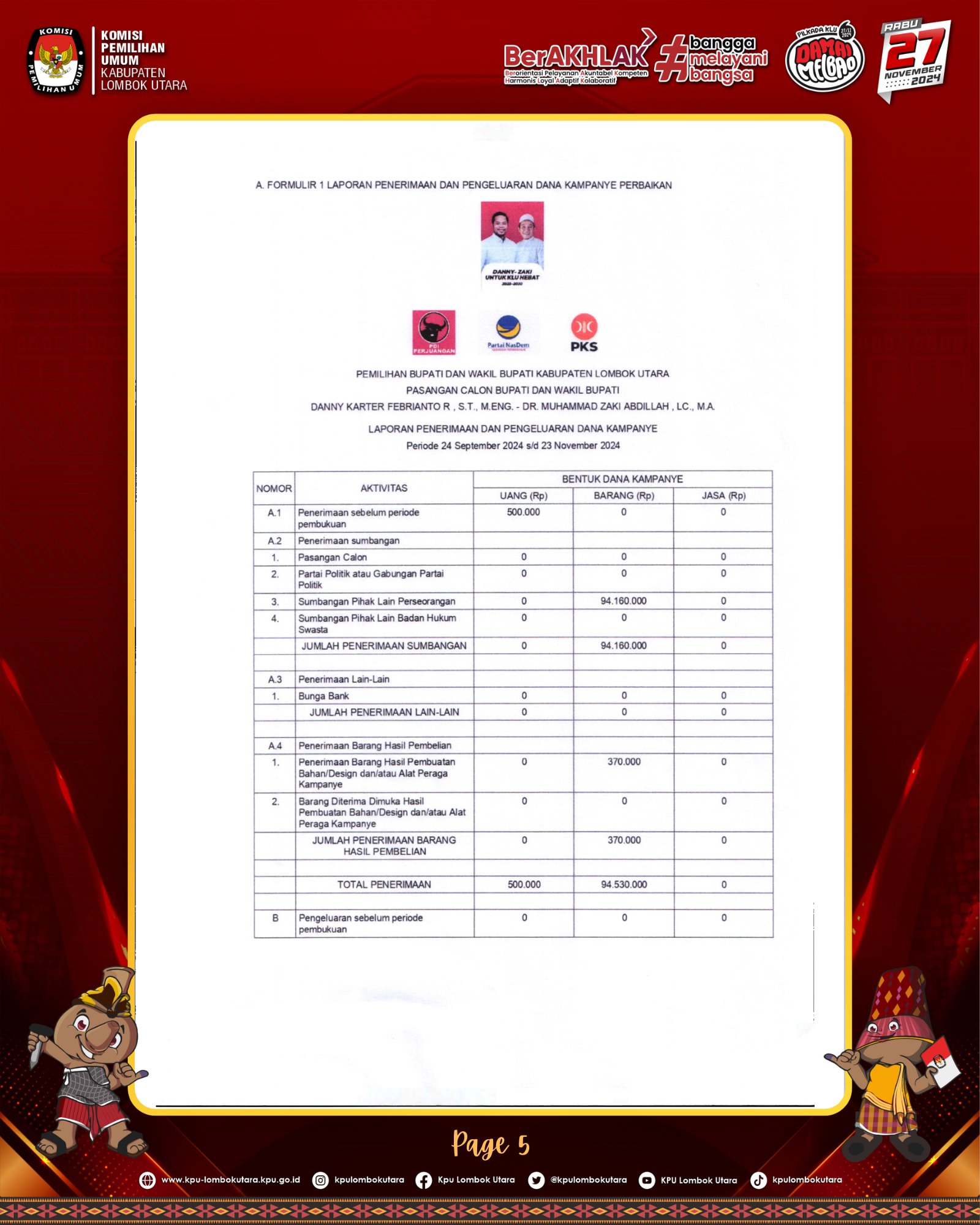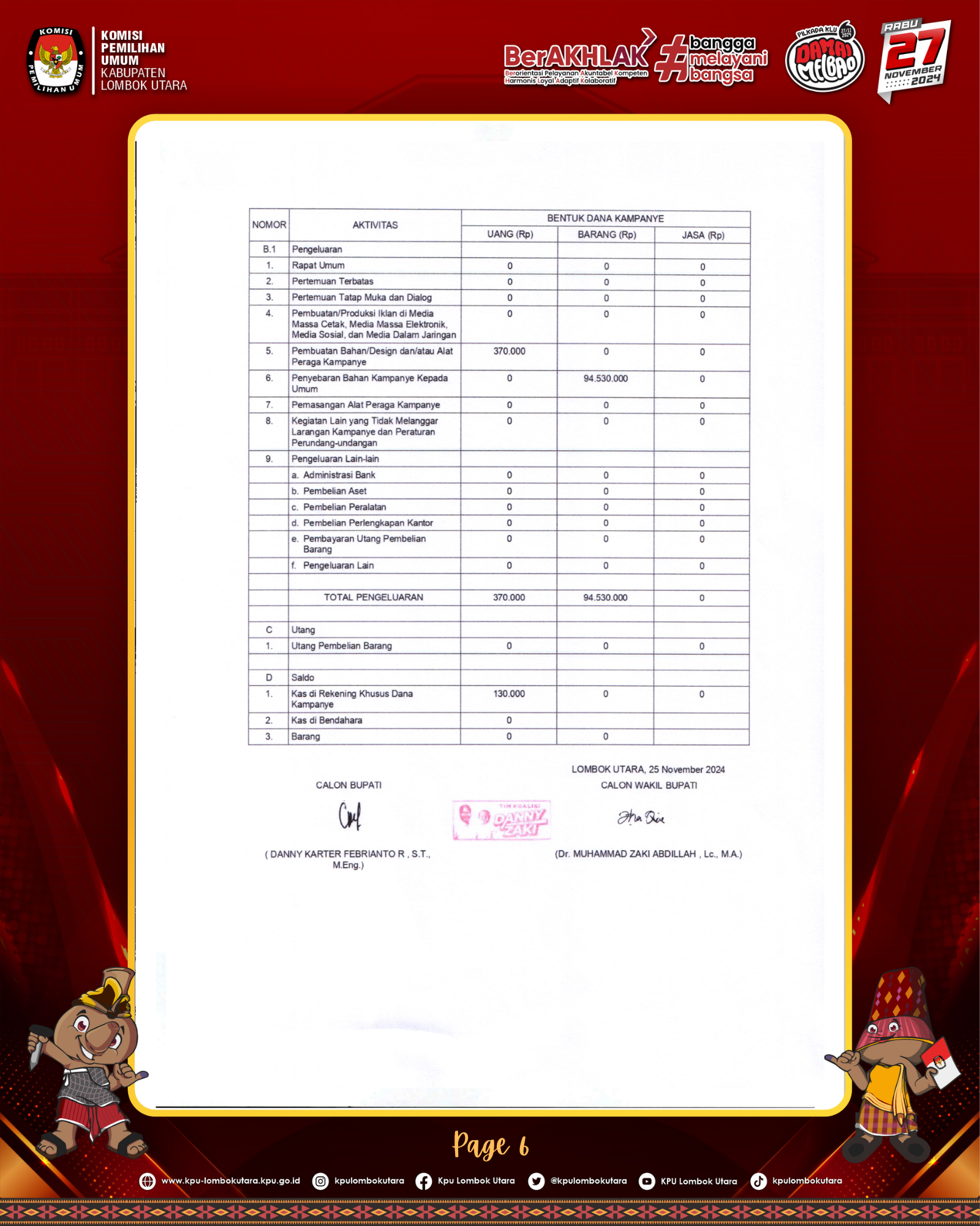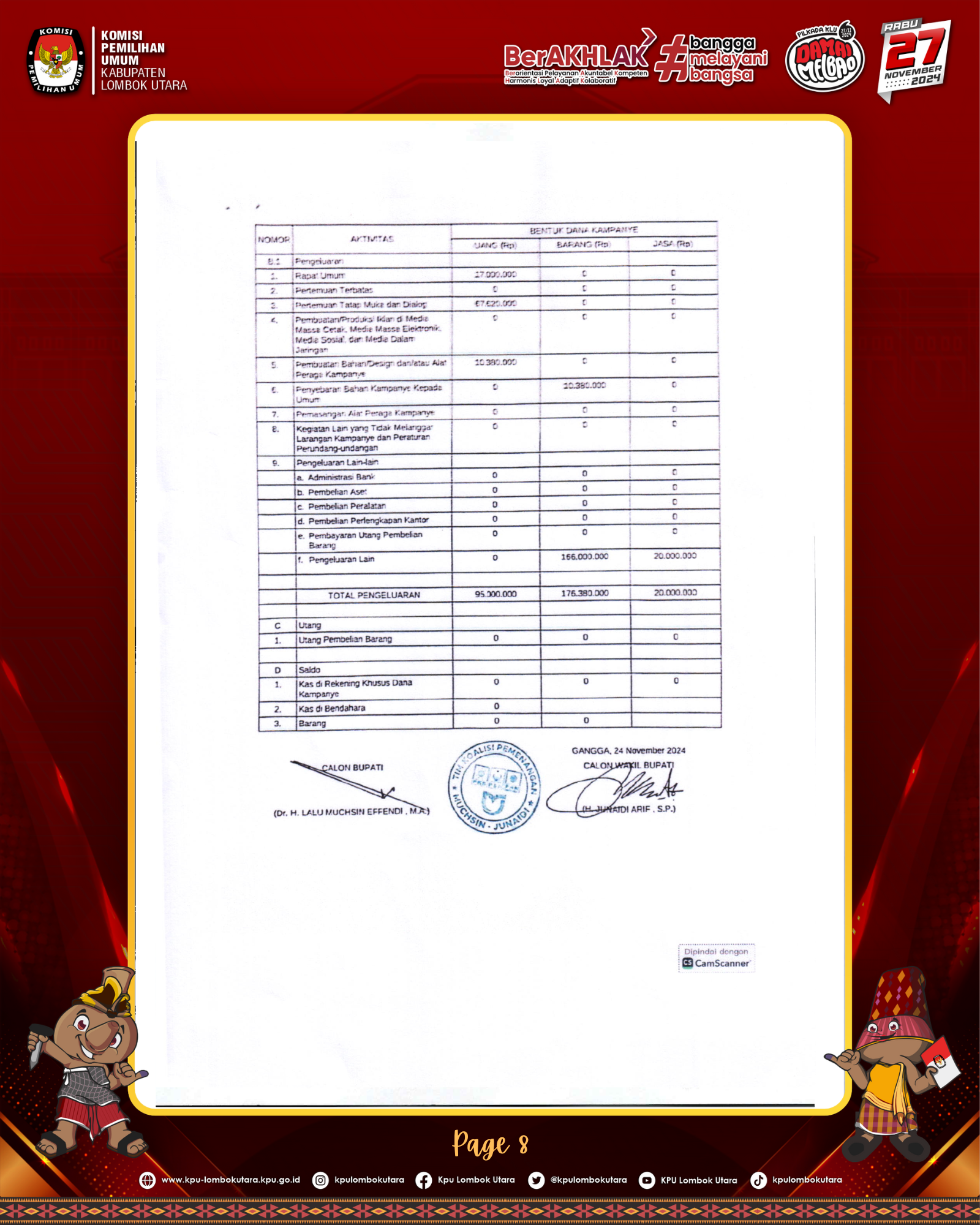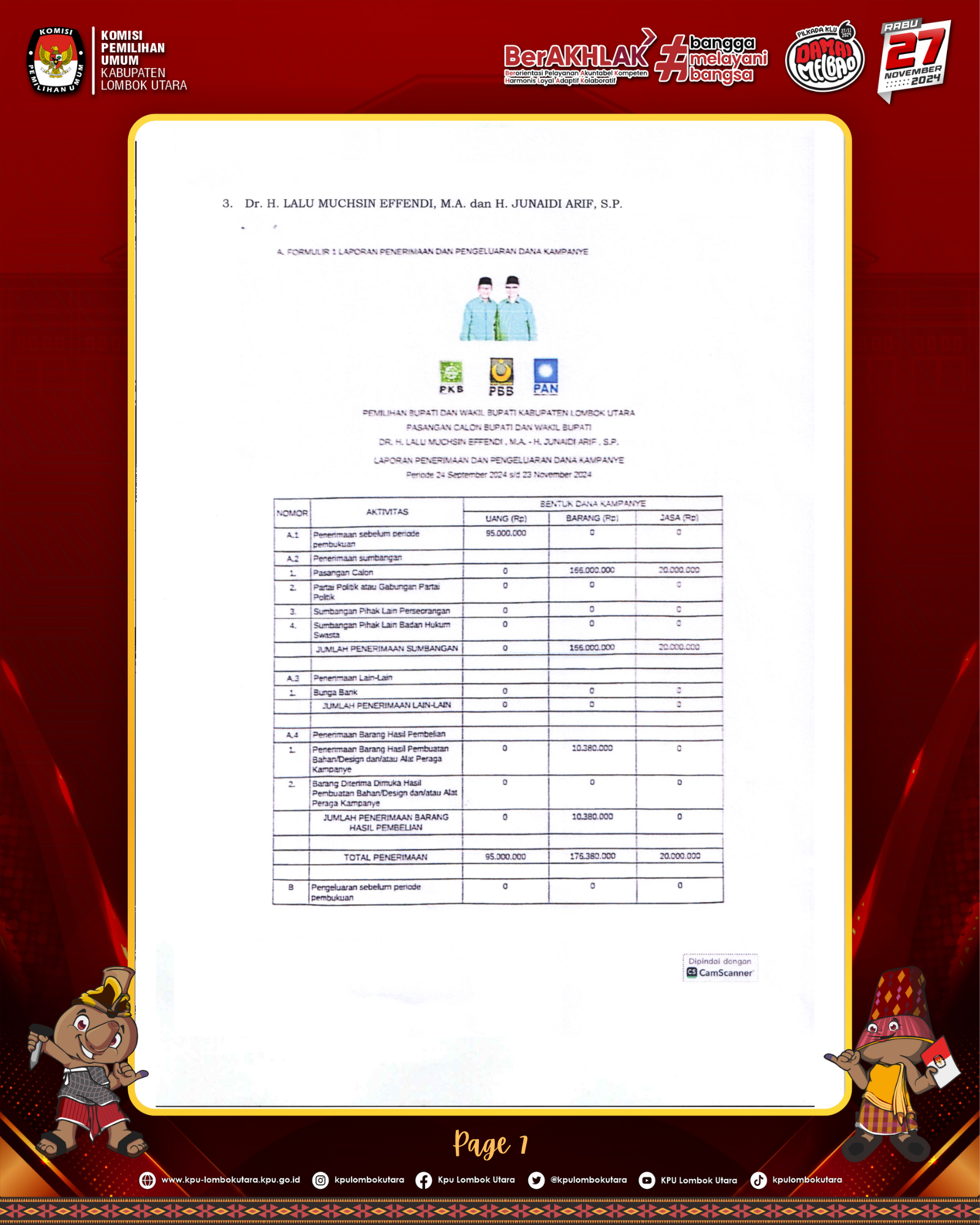 PENGUMUMAN KPU KABUPATEN LOMBOK UTARA TENTANG HASIL PENERIMAAN LAPORAN PENERIMAAN DAN PENGELUARAN DANA KAMPANYE PERBAIKAN PEMILIHAN BUPATI DAN WAKIL BUPATI LOMBOK UTARA TAHUN 2024