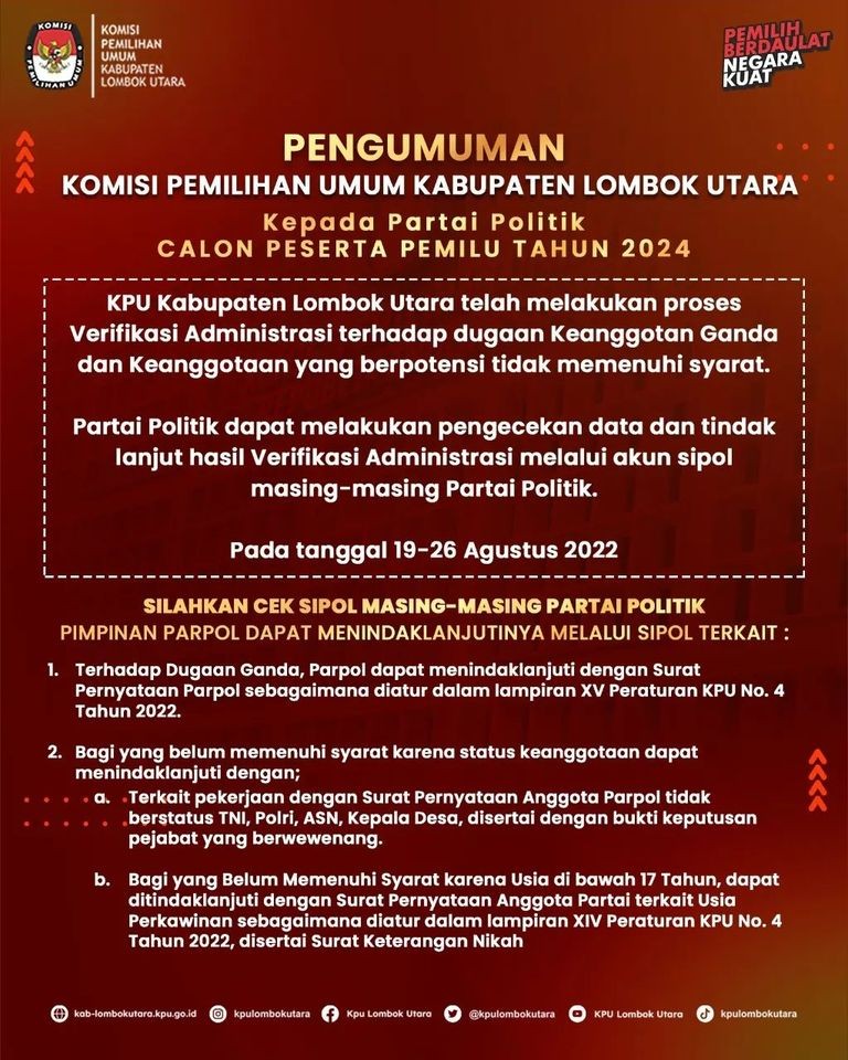 Berikut pengumuman yang disampaikan oleh KPU Kabupaten Lombok Utara kepada PARTAI POLITIK CALON PESERTA PEMILU TAHUN 2024.