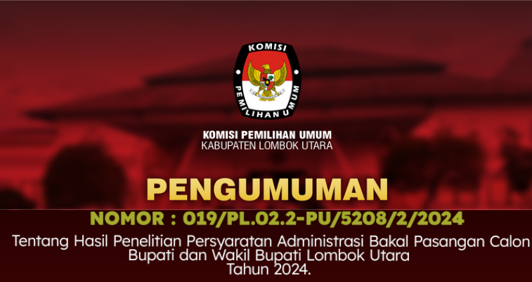 PENGUMUMAN KPU LOMBOK UTARA TENTANG HASIL PENELITIAN PERSYARATAN ADMINISTRASI BAKAL PASANGAN CALON BUPATI DAN WAKIL BUPATI LOMBOK UTARA TAHUN 2024. Sabtu, 14 September 2024 07:00 82 (DOWNLOAD PENGUMUMAN) Bagikan: Dilihat 82 Kali.