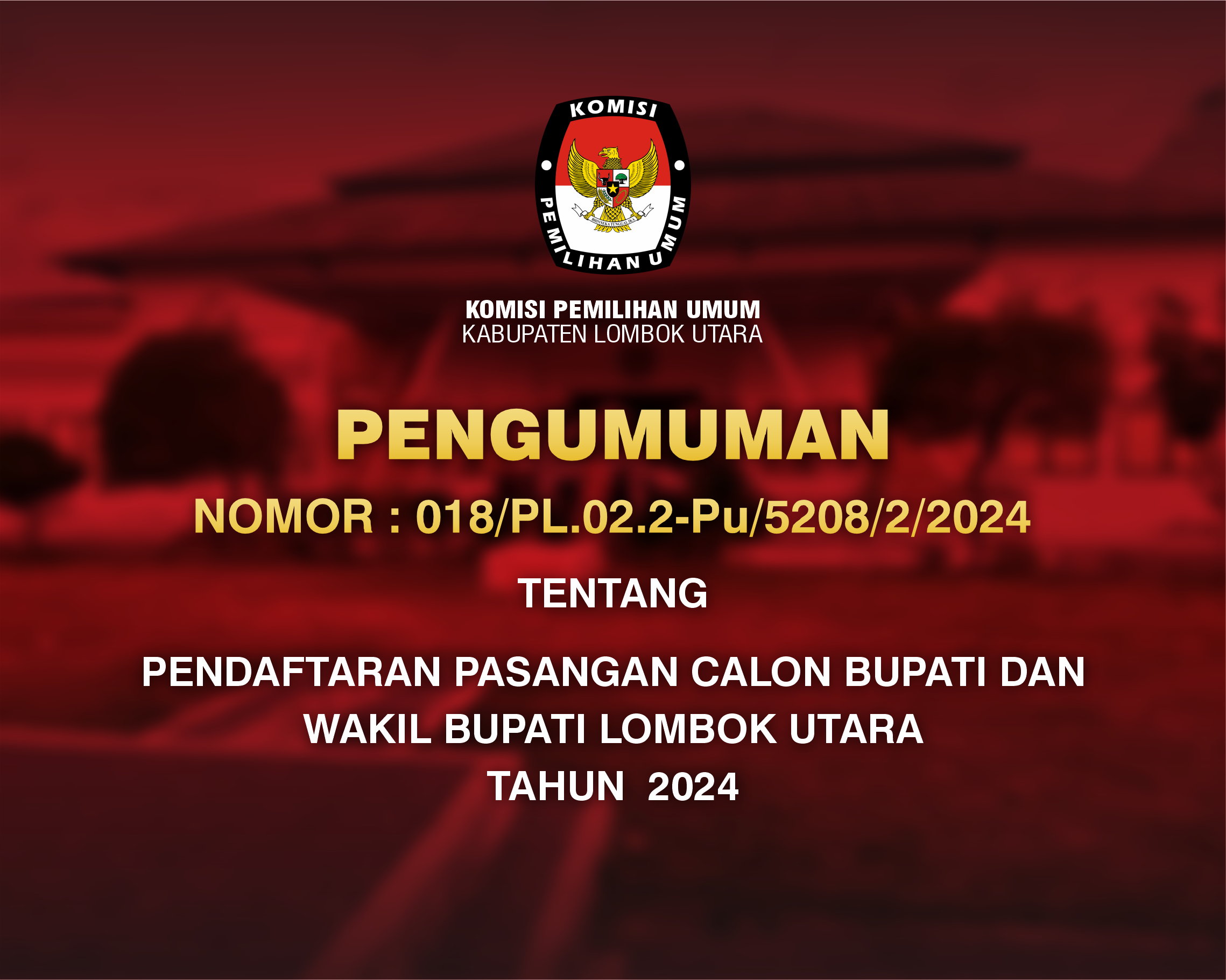 Pengumuman Pendaftaran Pasangan Calon Bupati Dan Wakil Bupati Lombok Utara Tahun 2024 Sabtu, 24 Agustus 2024 18:40 96 (DOWNLOAD PENGUMUMAN) Bagikan: Dilihat 96 Kali.