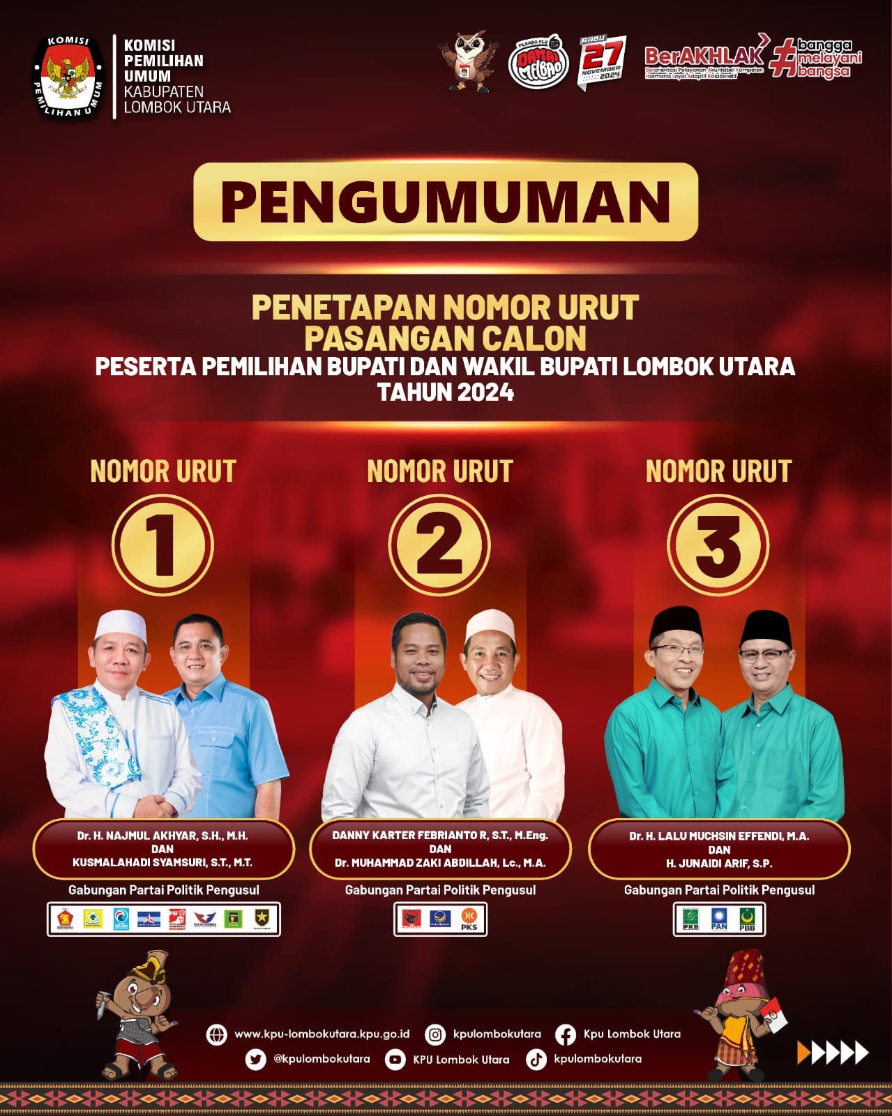 PENGUMUMAN PENETAPAN NOMOR URUT PASANGAN CALON PESERTA PEMILIHAN BUPATI DAN WAKIL BUPATI LOMBOK UTARA TAHUN2024.