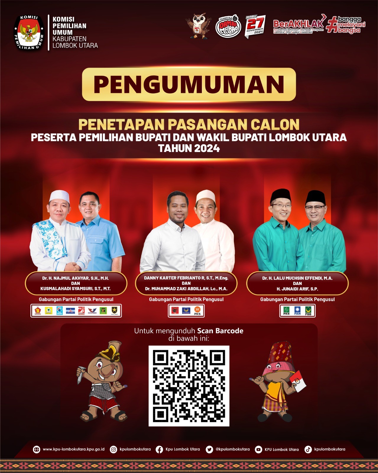 PENGUMUMAN PENETAPAN PASANGAN CALON PESERTA PEMILIHAN BUPATI DAN WAKIL BUPATI LOMBOK UTARA TAHUN 2024 Kamis, 01 Januari 1970 22:08 72 ( DOWNLOAD DOKUMEN) Bagikan: Dilihat 72 Kali.