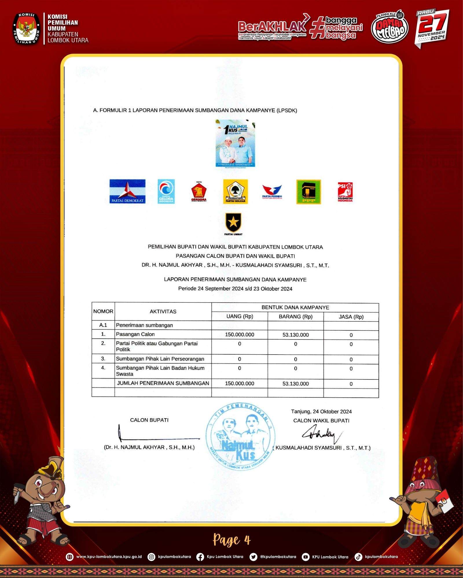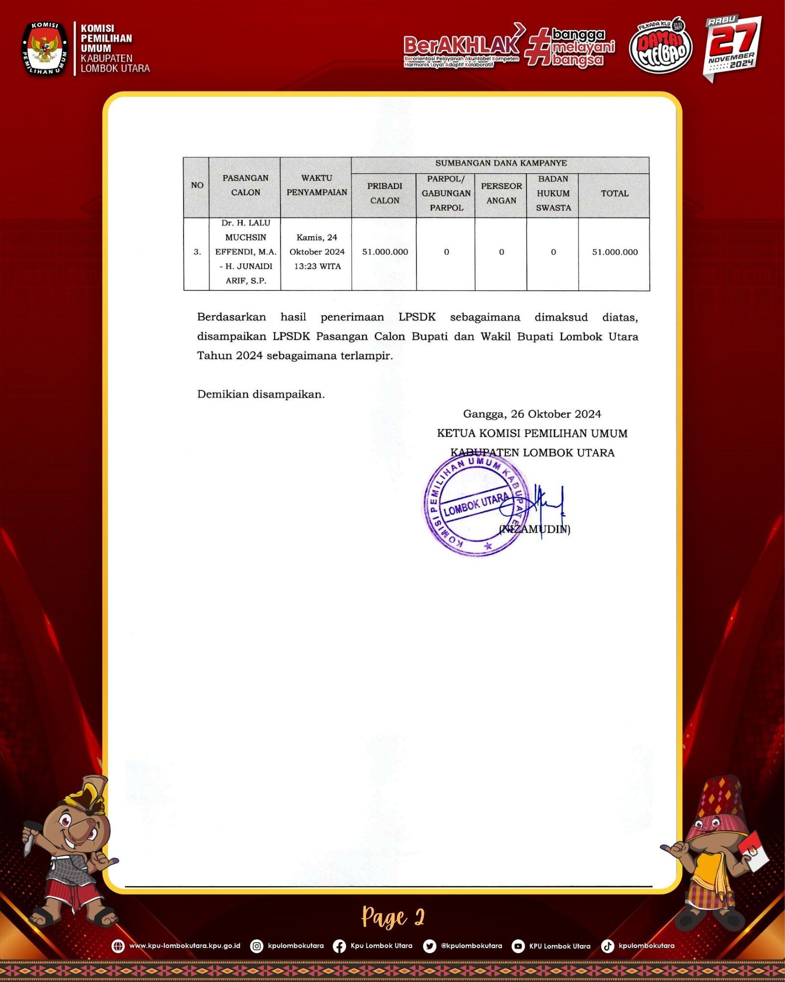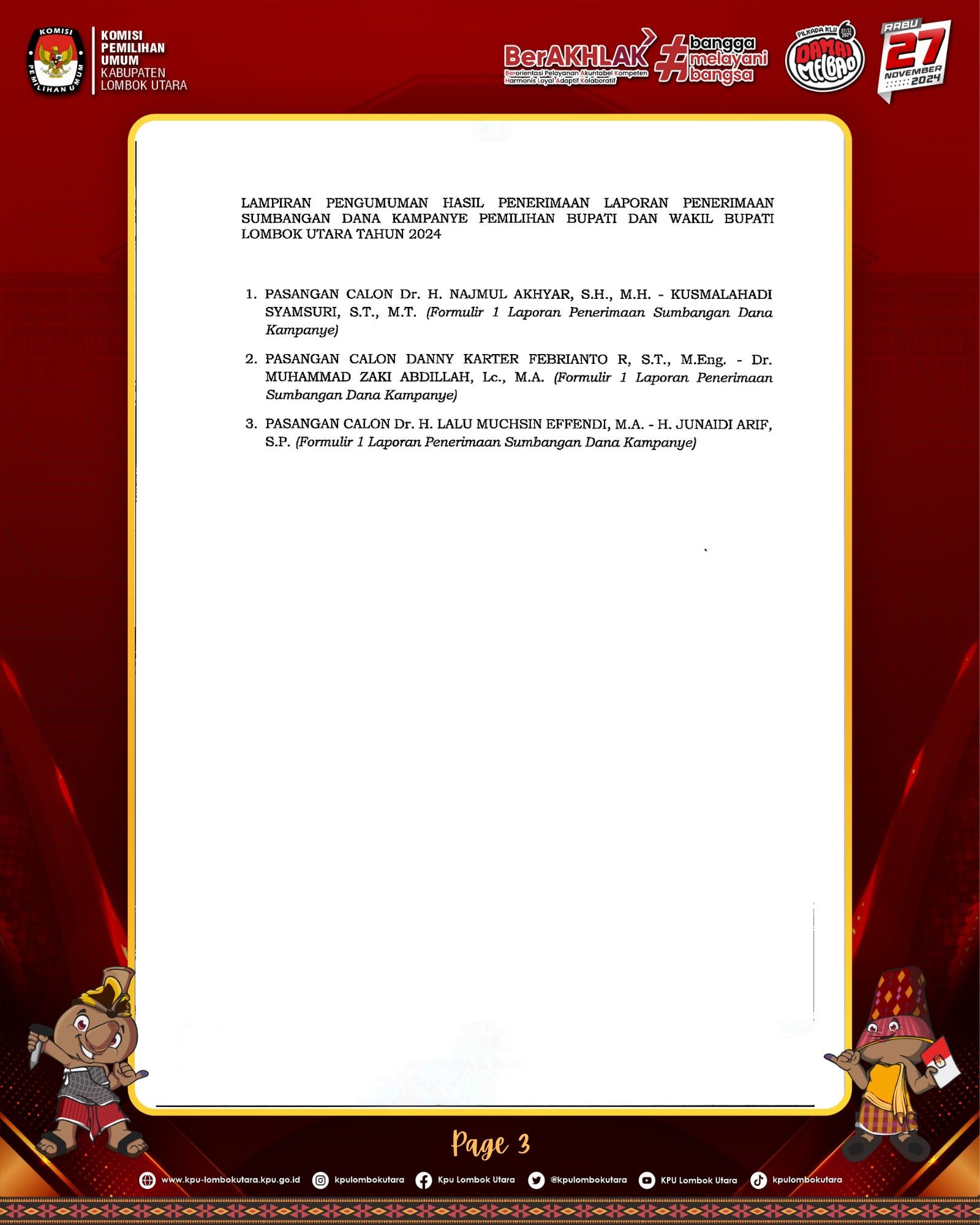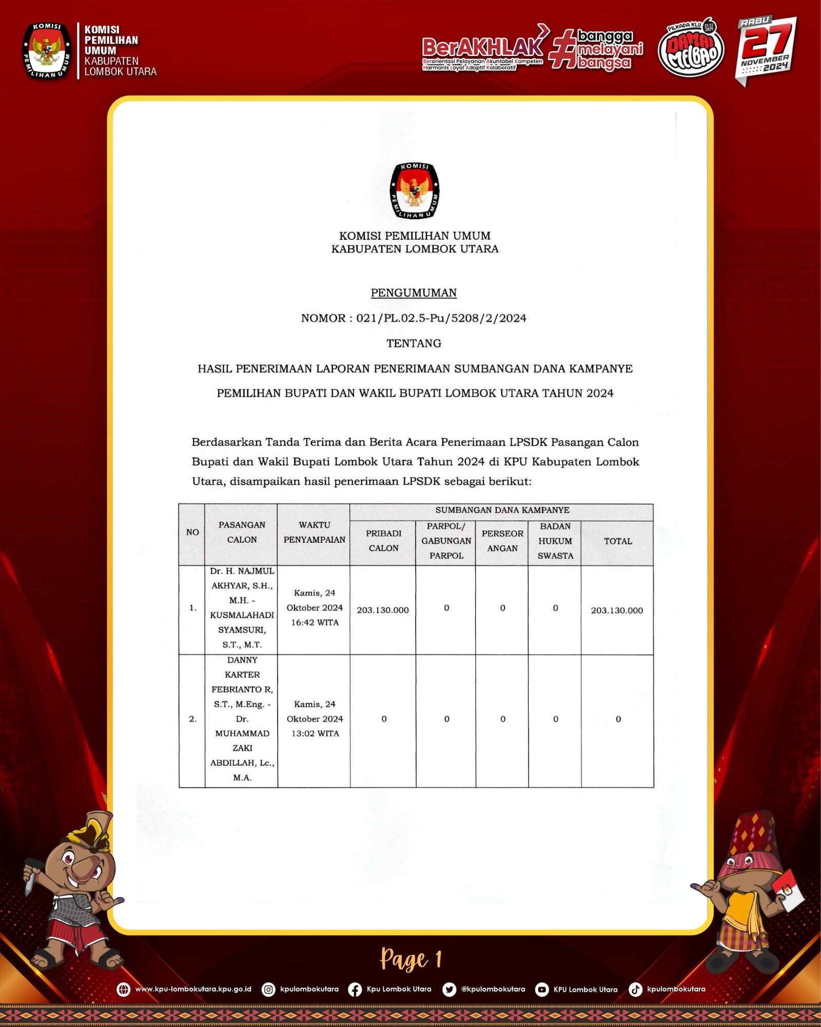 PENGUMUMAN TENTANG HASIL PENERIMAAN SUMBANGAN DANA KAMPANYE PEMILIHAN BUPATI DAN WAKIL BUPATI LOMBOK UTARA TAHUN 2024