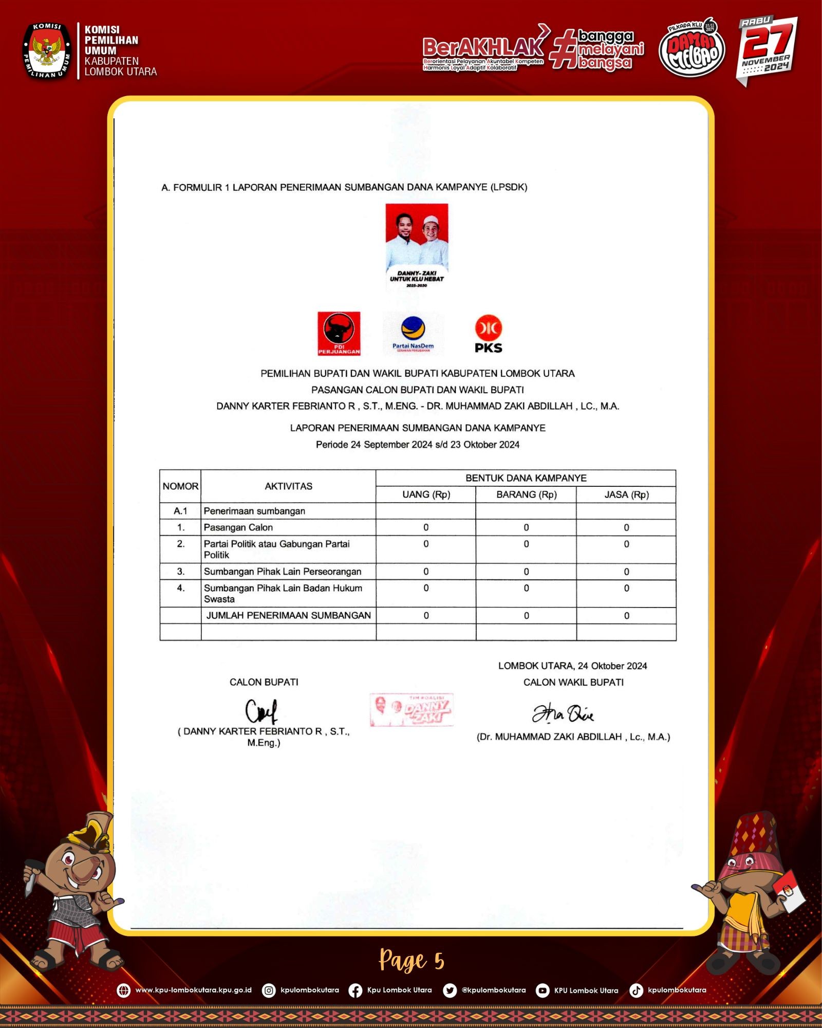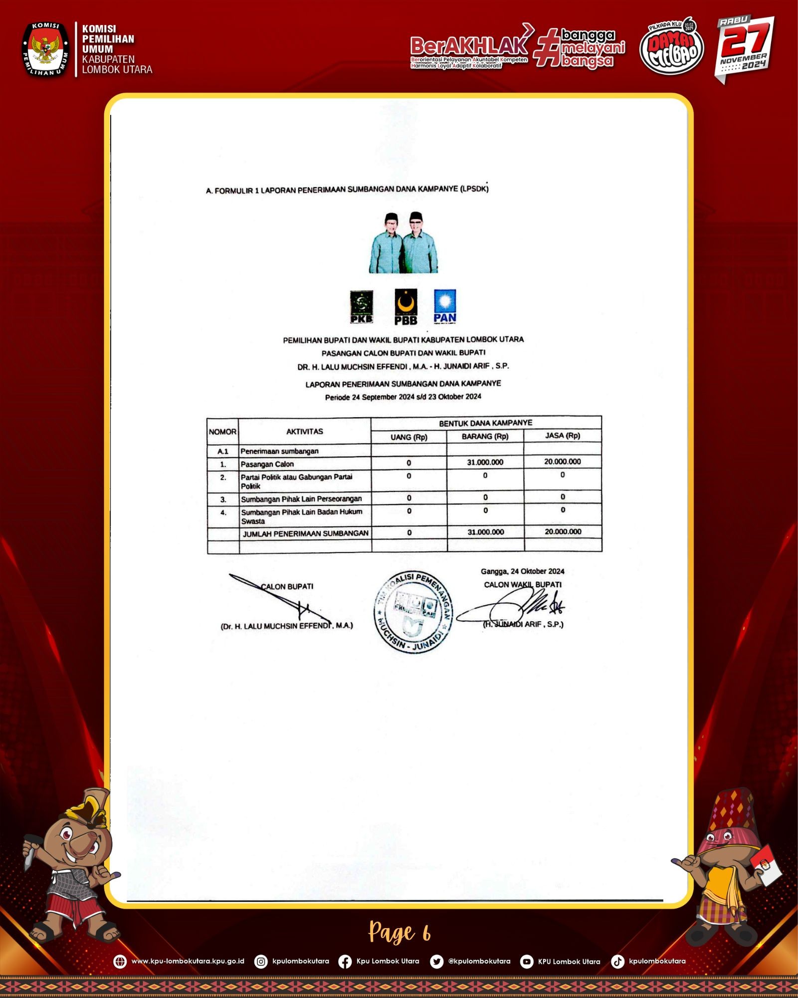 #TemanPemilih, Pengumuman KPU Lombok Utara Nomor: 021/PL.02.5-Pu/5208/2/2024 Tentang Hasil Penerimaan Sumbangan Dana Kampanye Pemilihan Bupati dan Wakil Bupati Lombok Utara Tahun 2024