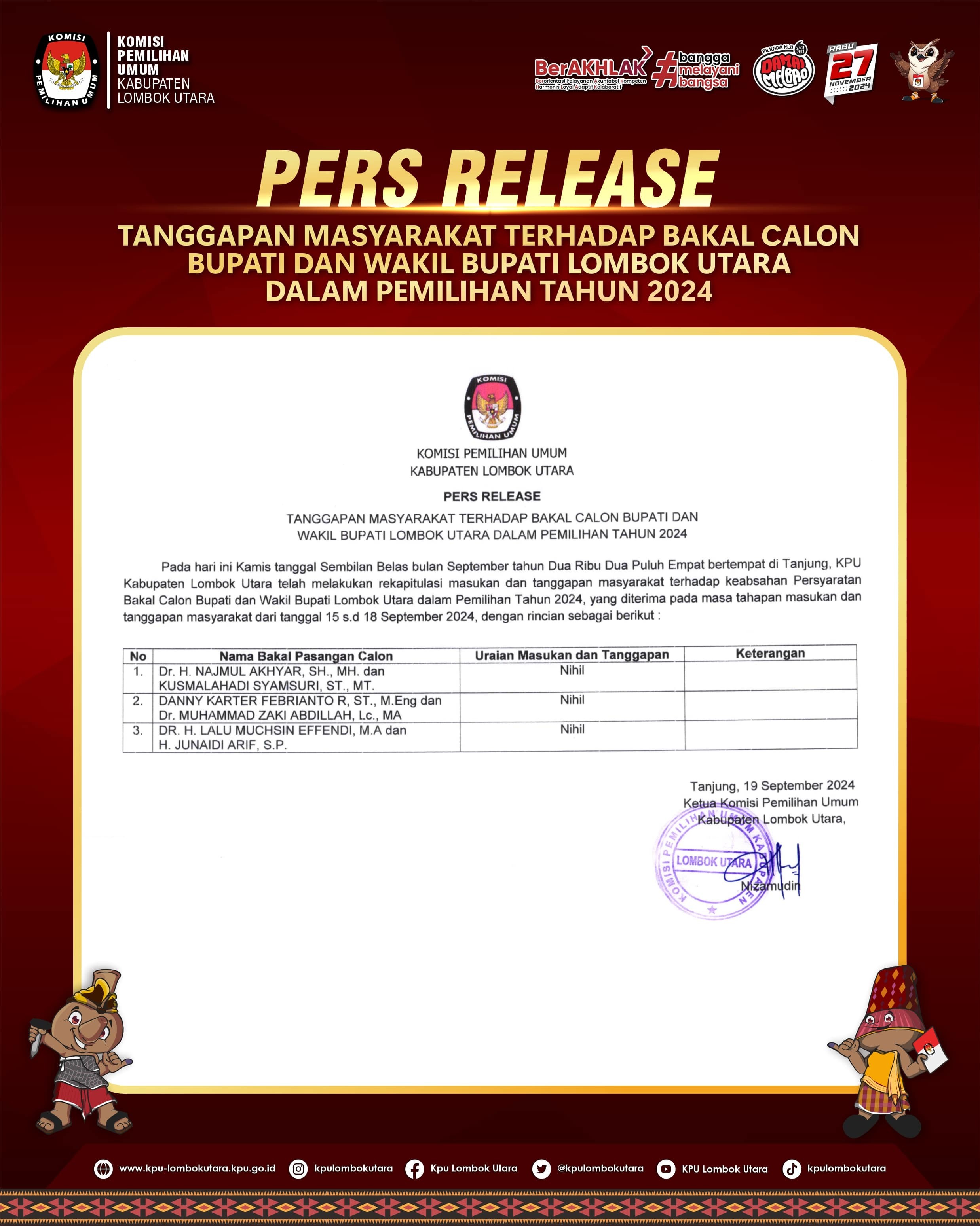 #TemanPemilih, PERS RELEASE Tanggapan Masyarakat terhadap Bakal Calon Bupati dan Wakil Bupati Lombok Utara dalam Pemilihan Tahun 2024.
