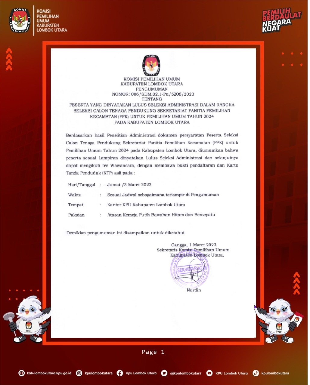 PESERTA YANG DINYATAKAKN LULUS SELEKSI ADMINISTRASI DALAM RANGKA SELEKSI CALON TENAGA PENDUKUNG SEKRETARIAT PANITIA PEMILIHAN KECAMATAN (PPK) UNTUK PEMILIHAN UMUM TAHUN 2024 PADA KABUPATEN LOMBOK UTARA