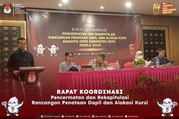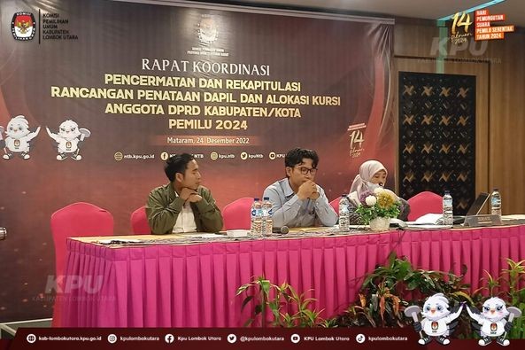 Ketua KPU Kabupaten Lombok Utara, Ketua Divisi Teknis Penyelenggaraan, Kasubbag Teknis dan Parhumas serta Operator Sidapil menghadiri Rapat Koordinasi Pencermatan dan Rekapitulasi Rancangan Penataan Dapil dan Alokasi Kursi Anggota DPRD Kabupaten/Kota dalam Pemilihan Umum Tahun 2024 yang di selenggarakan oleh KPU Provinsi NTB bertempat di Hotel Fave, Mataram, Jum'at (16/12).