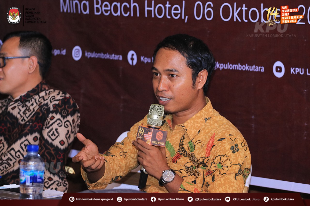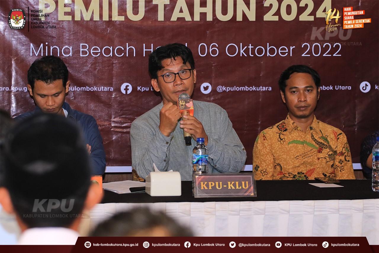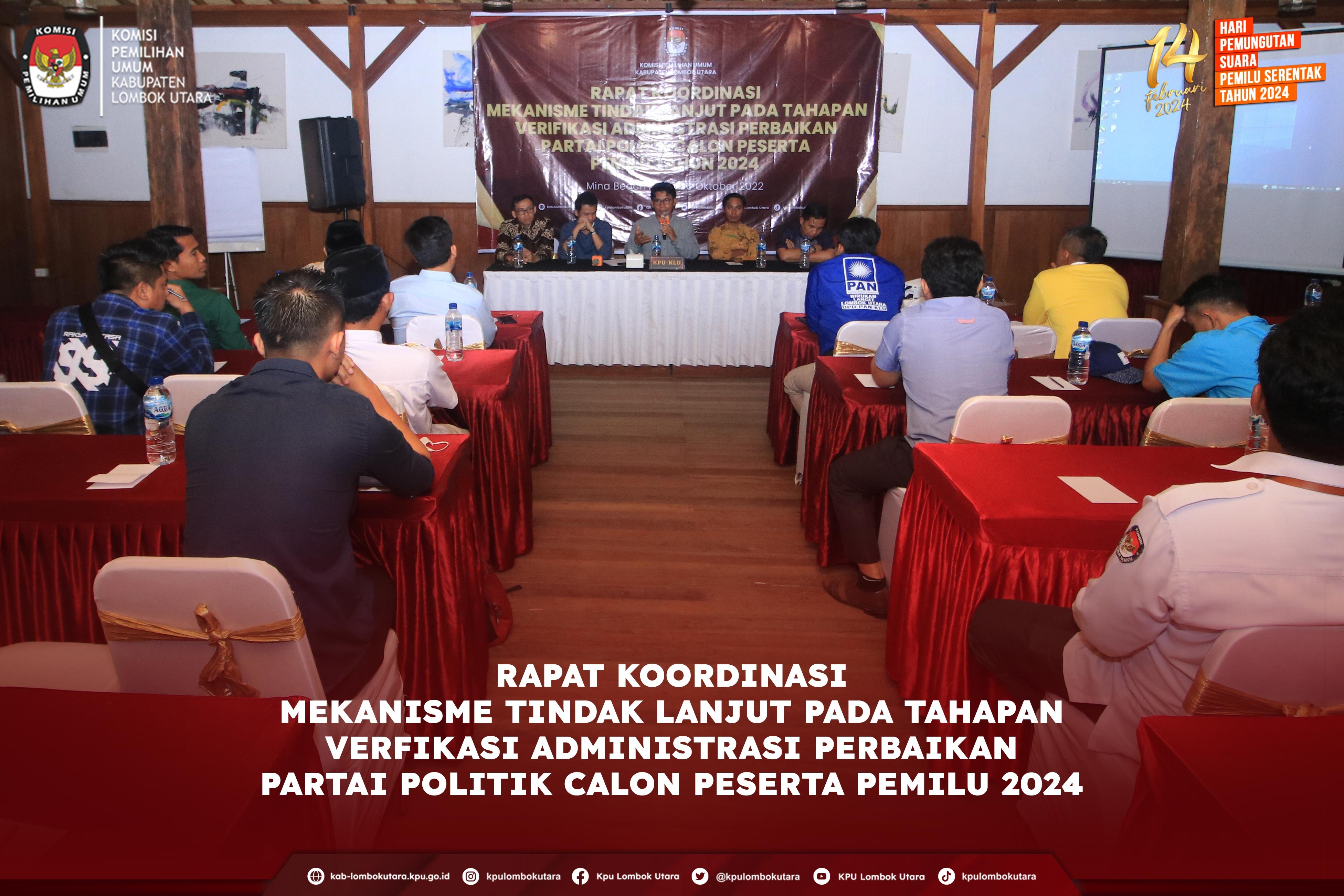 GANGGA (kab-lombokutara.kpu.go.id) - Komisi Pemilihan Umum (KPU) Kabupaten Lombok Utara (KLU) mengadakan Rapat Koordinasi Mekanisme Tindak Lanjut pada Tahapan Verifikasi Administrasi Perbaikan Partai Politik Calon Peserta Pemilu Tahun 2024 bertempat di Mina Hotel Tanjung yang dihadiri oleh Ketua dan Anggota KPU Kabupaten Lombok Utara, Sekretaris KPU Kabuapten Lombok Utara, Kapolres Lombok Utara, Partai Politik Calon Peserta Pemilu se-Kabupaten Lombok Utara serta Verifikator dan Tenaga Teknis Pendukung Verifikasi Lingkup KPU Lombok Utara. Tanjung (06/10)