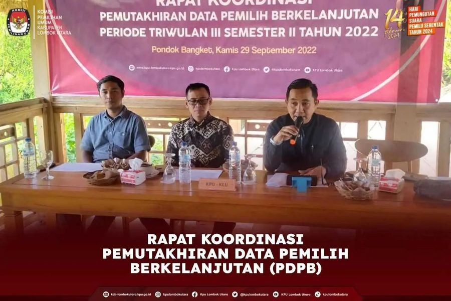 GANGGA (kab-lombokutara.kpu.go.id) - Komisi Pemilihan Umum (KPU) Kabupaten Lombok Utara (KLU) menggelar Rapat Koordinasi Pemutahiran Data Pemilih Berkelanjutan (PDPB) Periode Triwulan III (Tiga) Semester 2 Tahun 2022 bersama dengan Stakeholder; Bawaslu, Kapolres, Disdukcapil, Kemenag, BPS dan Dikes KLU bertempat di Pondok Bangket, Tanjung. Kamis (29/09)