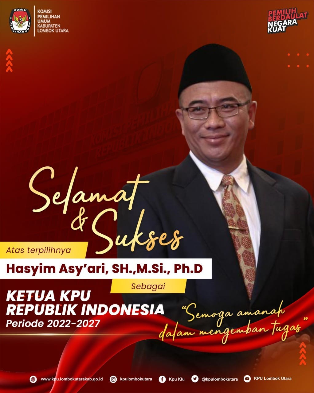 Keluarga Besar KPU Kabupaten Lombok Utara mengucapkan Selamat dan Sukses atas terpilihnya Hasyim Asy'ari, SH., M.Si., Ph.D sebagai Ketua KPU Republik Indonesia periode 2022-2027