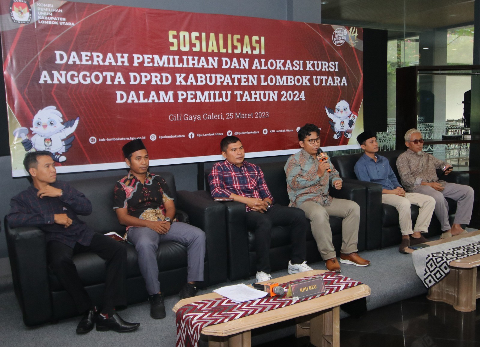 Juraidin Ketua KPU KLU dalam sambutannya menyampaikan bahwa sosialisasi ini digelar untuk memberikan informasi kepada perwakilan masyarakat lintas sektor tentang perubahan atau pergeseran alokasi kursi Kabupaten Lombok Utara yang sebelumnya 3 Dapil menjadi 5 Dapil.