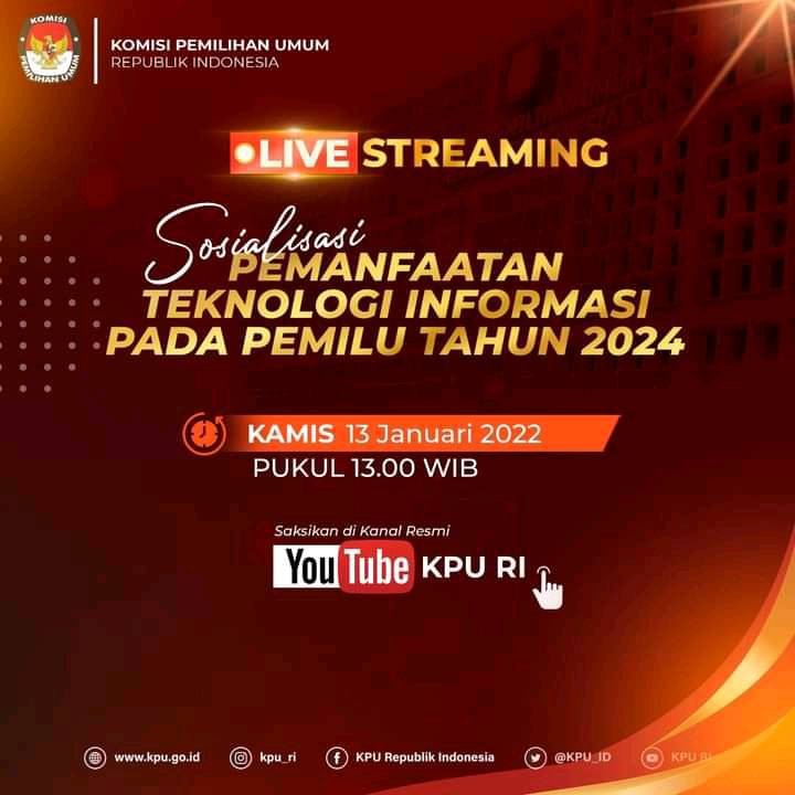Ikuti live streaming Sosialisasi Pemanfaatan Teknologi Informasi pada Pemilu Tahun 2024, Hari ini Kamis 13 Januari 2022 Pukul 13.00 WIB.