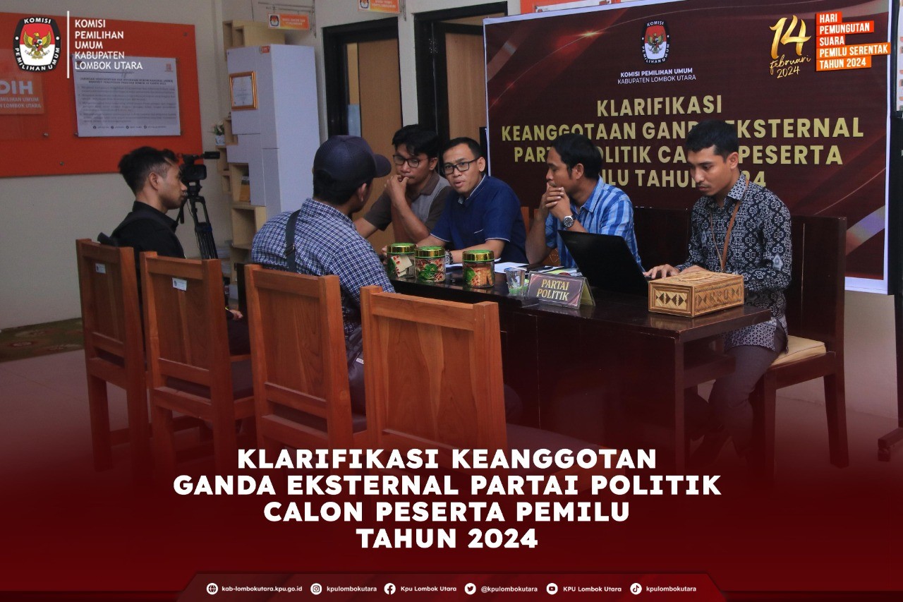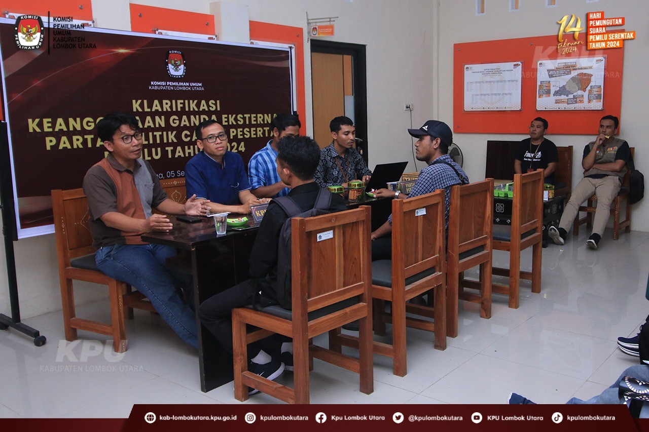 Ketua Divisi Teknis Penyelenggaraan Kardi menjelaskan bahwa dari hasil verifikasi administrasi perbaikan yang telah dilaksanakan, ditemukan sejumlah keanggotaan ganda eksternal antar Partai Politik diantaranya Partai Gelora dan Partai Buruh, terkait hal tersebut KPU Kabupaten Lombok Utara mengundang Tim Penghubung/LO masing-masing Partai Politik dimaksud.