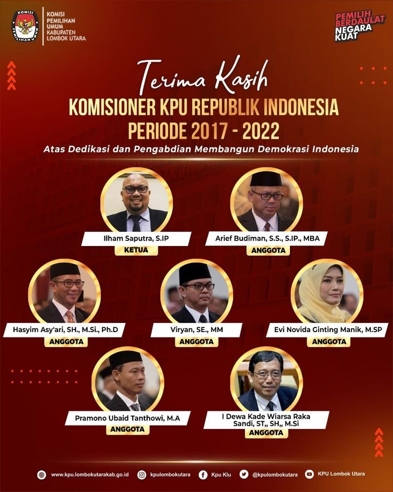 Keluarga Besar KPU Kabupaten Lombok Utara mengucapkan terimakasih kepada Pimpinan KPU Republik Indonesia Periode 2017-2022 atas Pengabdian dan Dedikasinya mengawal Demokrasi Indonesia